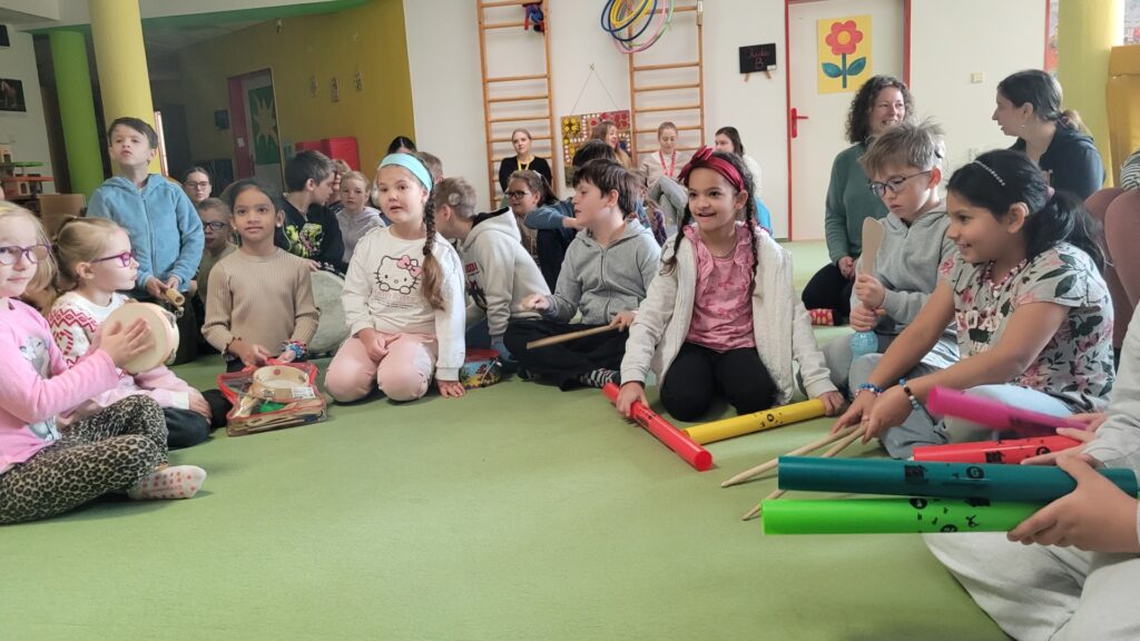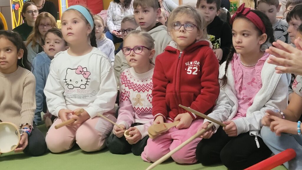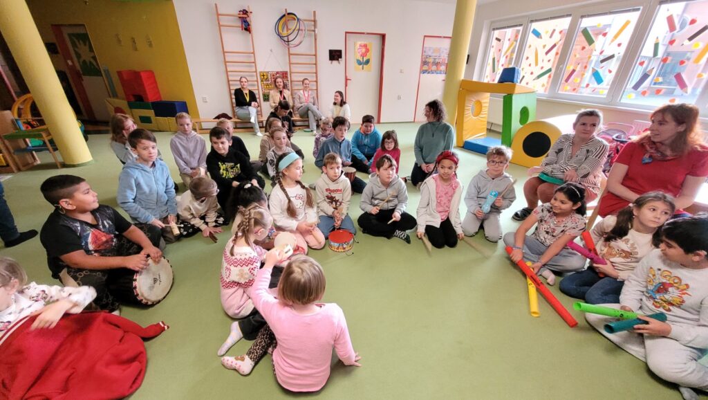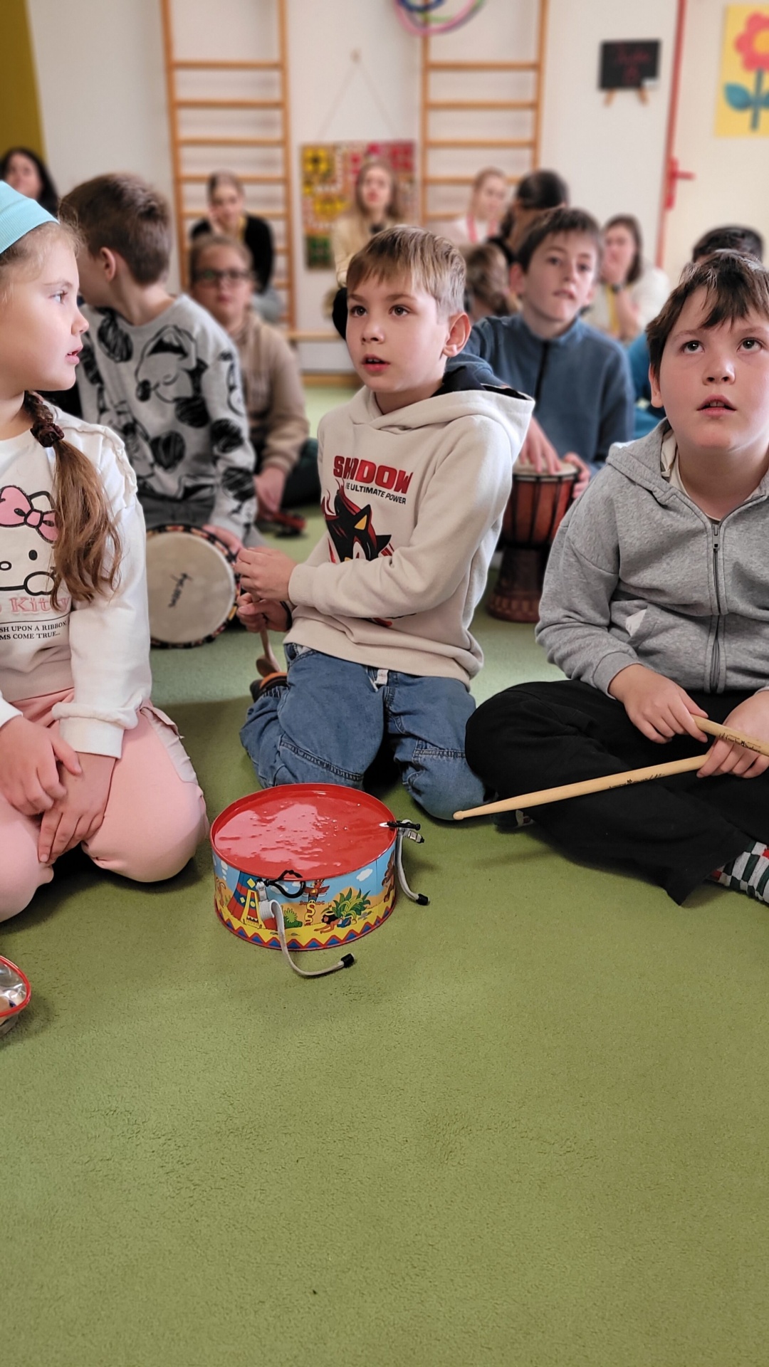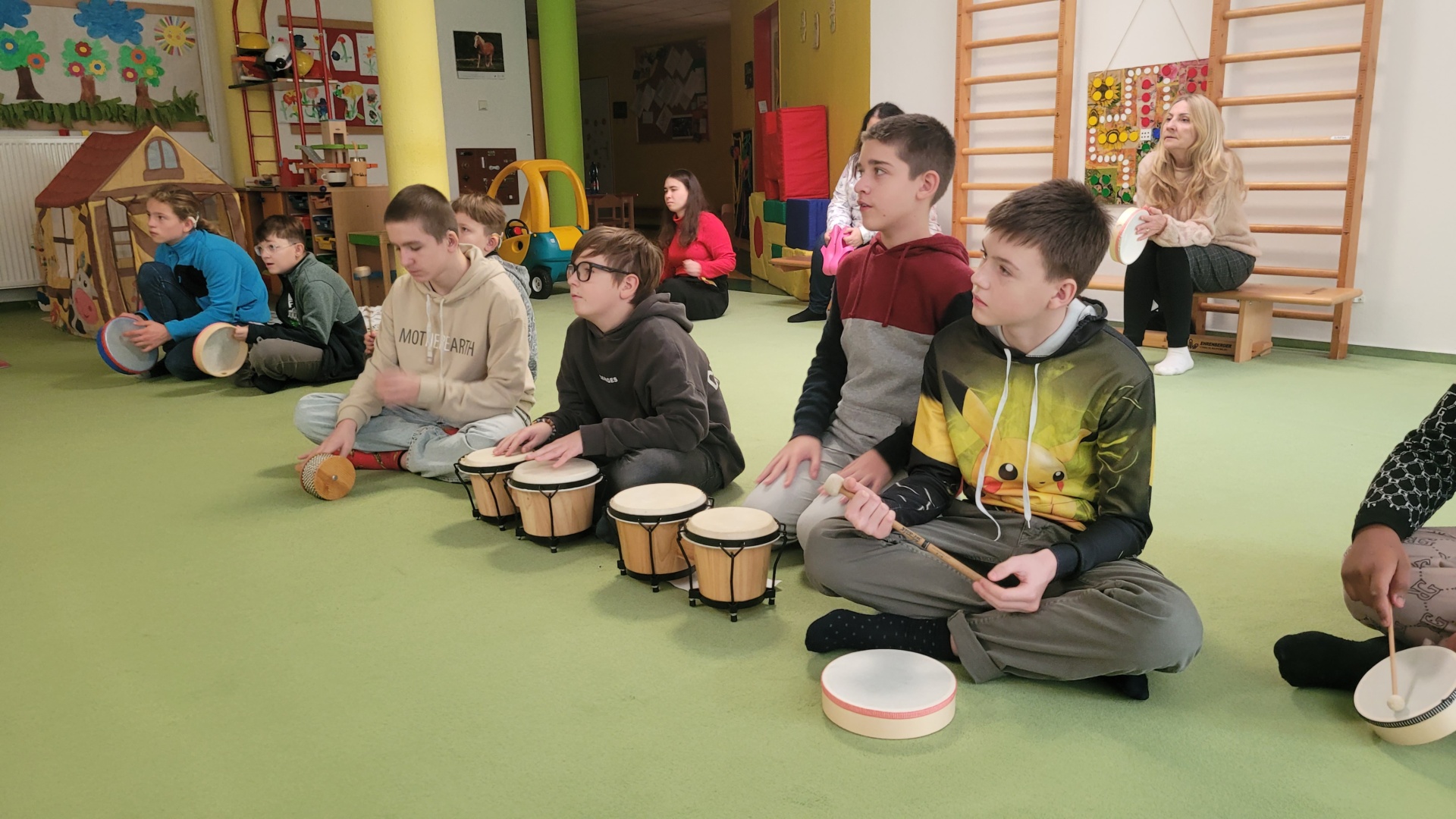 Velký den však nastal ve středu 19. 11. 2025 v 9:00 hod. Děti i žáci byli rozděleni do čtyř skupin: MŠ, I. stupeň ZŠ, II. stupeň ZŠ, SŠ a připojili se k nám dokonce i studenti, kteří u nás vykonávali praxi. V příjemném prostředí MŠ jsme se vrátili k příběhu Tonyho a Týnky, pustili si krátké video, zahráli jsme scénky, naučili se signál pomoci a dokonce jsme tančili bulharský tanec „Ljube, ljube“, který pomáhá z těla odstranit přebytečnou agresi a napětí. Na závěr jsme si společné pod taktovkou jednoho nebo dvou dirigentů zabubnovali.
