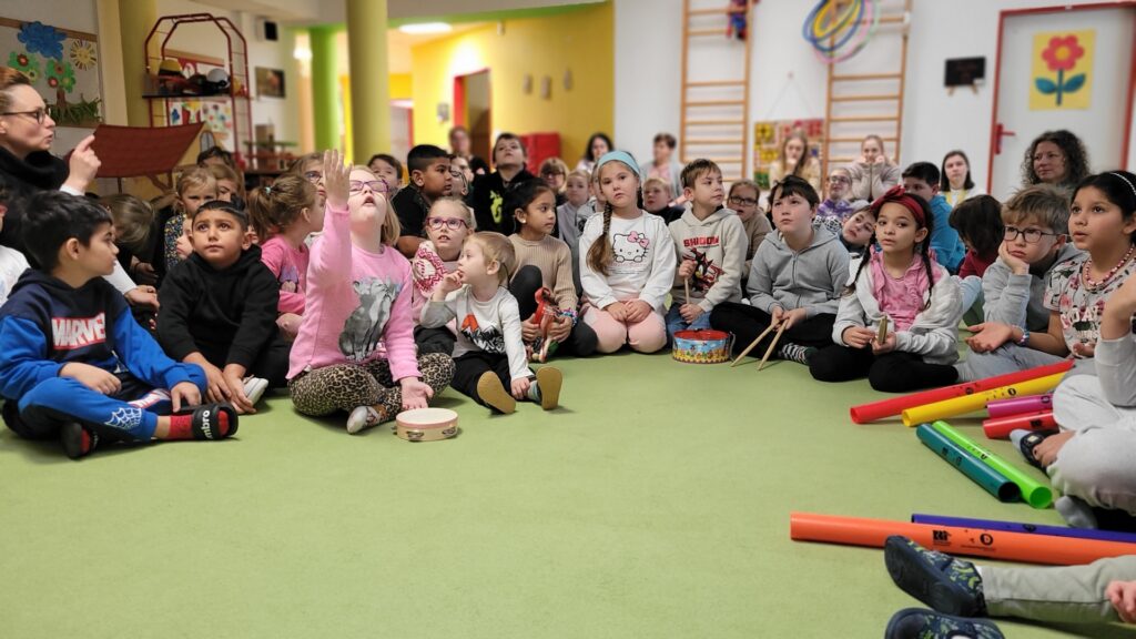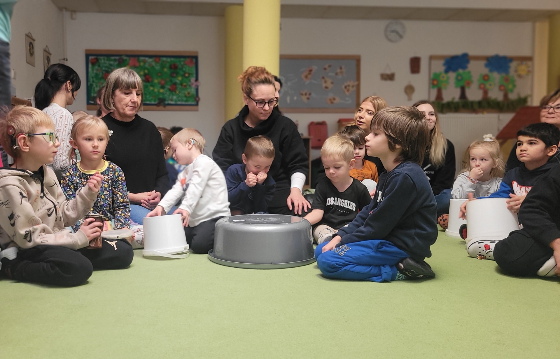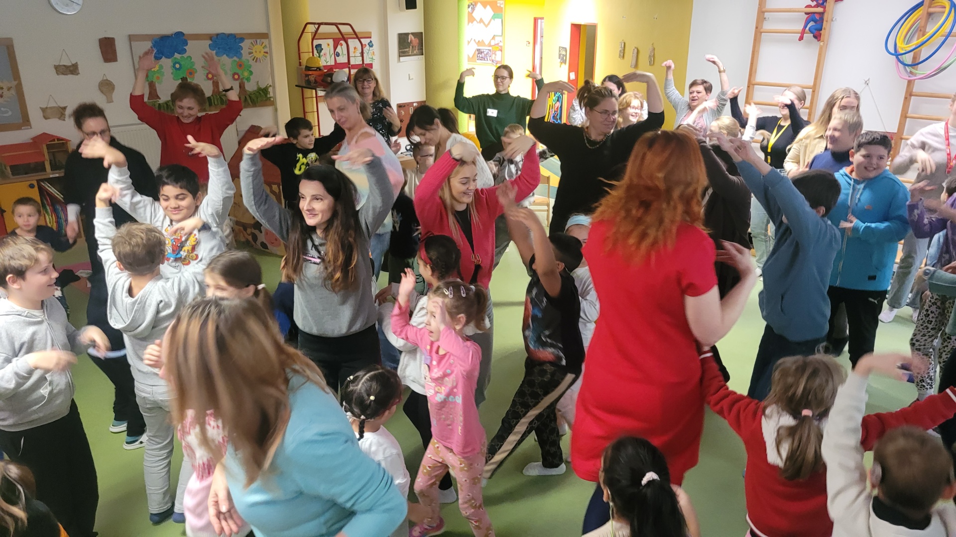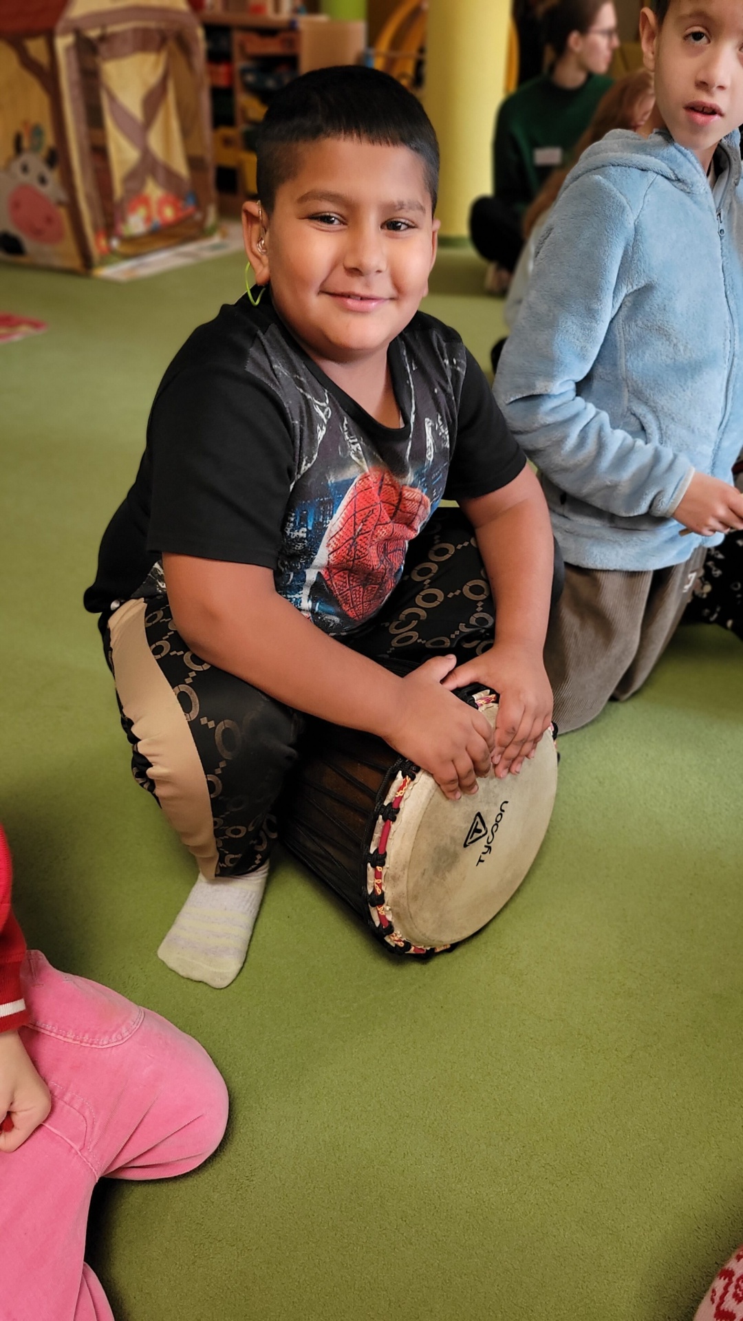 Velký den však nastal ve středu 19. 11. 2025 v 9:00 hod. Děti i žáci byli rozděleni do čtyř skupin: MŠ, I. stupeň ZŠ, II. stupeň ZŠ, SŠ a připojili se k nám dokonce i studenti, kteří u nás vykonávali praxi. V příjemném prostředí MŠ jsme se vrátili k příběhu Tonyho a Týnky, pustili si krátké video, zahráli jsme scénky, naučili se signál pomoci a dokonce jsme tančili bulharský tanec „Ljube, ljube“, který pomáhá z těla odstranit přebytečnou agresi a napětí. Na závěr jsme si společné pod taktovkou jednoho nebo dvou dirigentů zabubnovali.