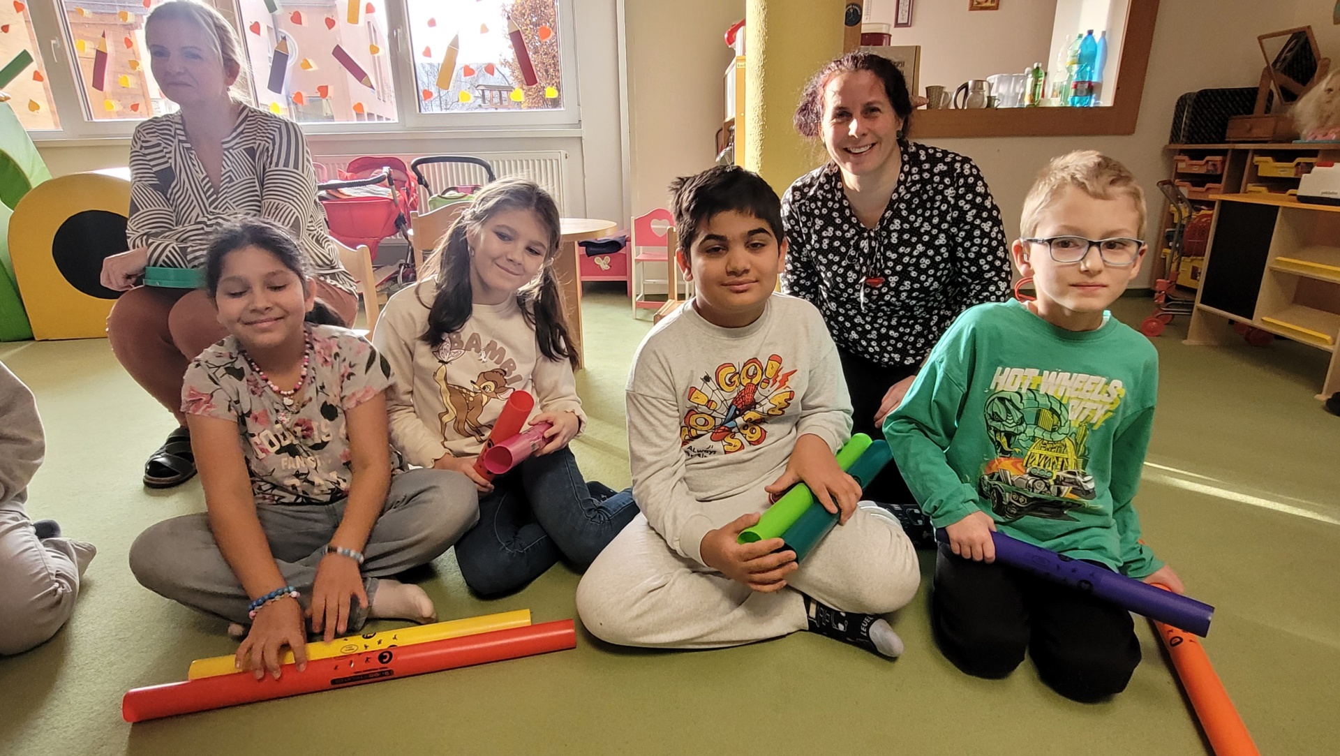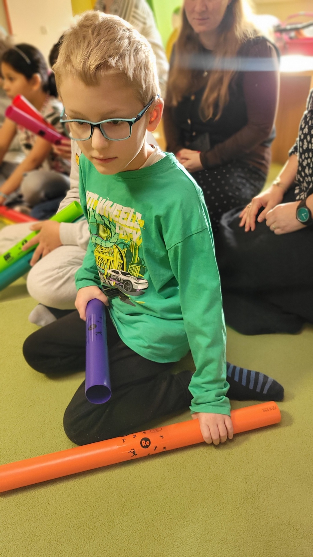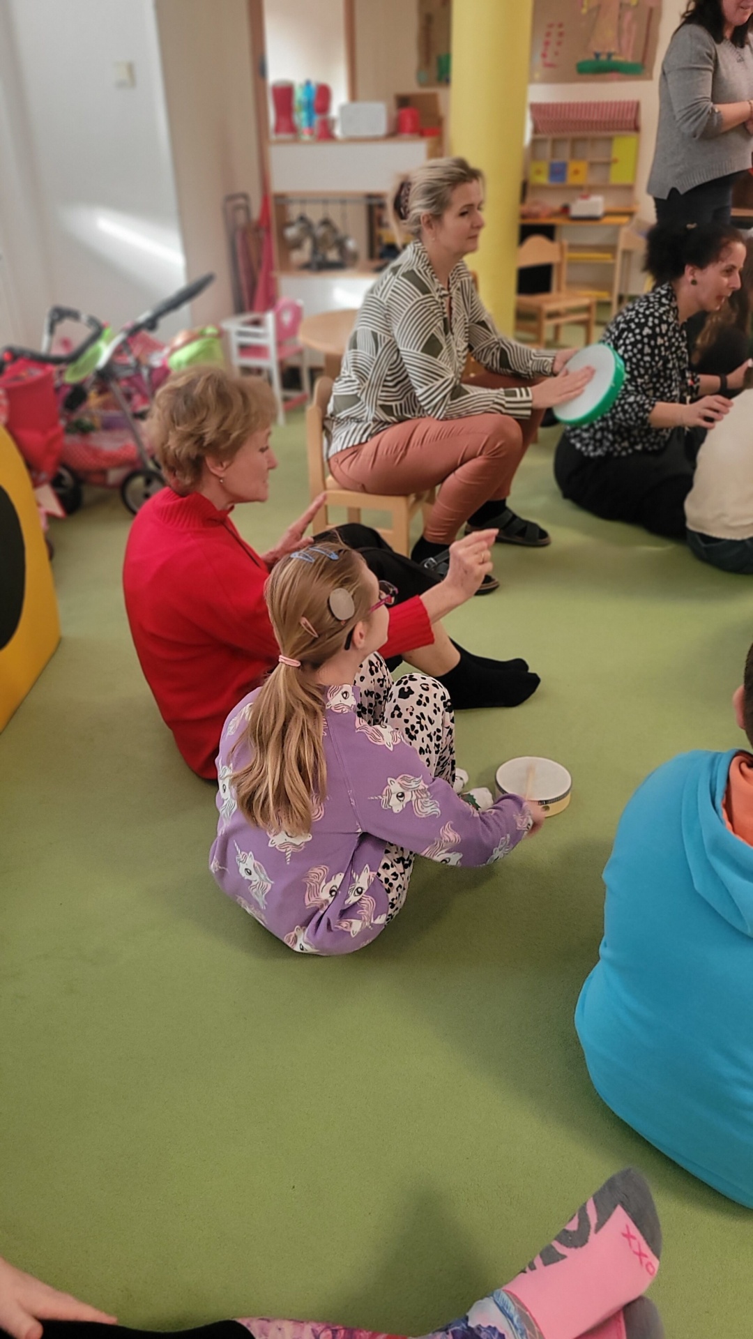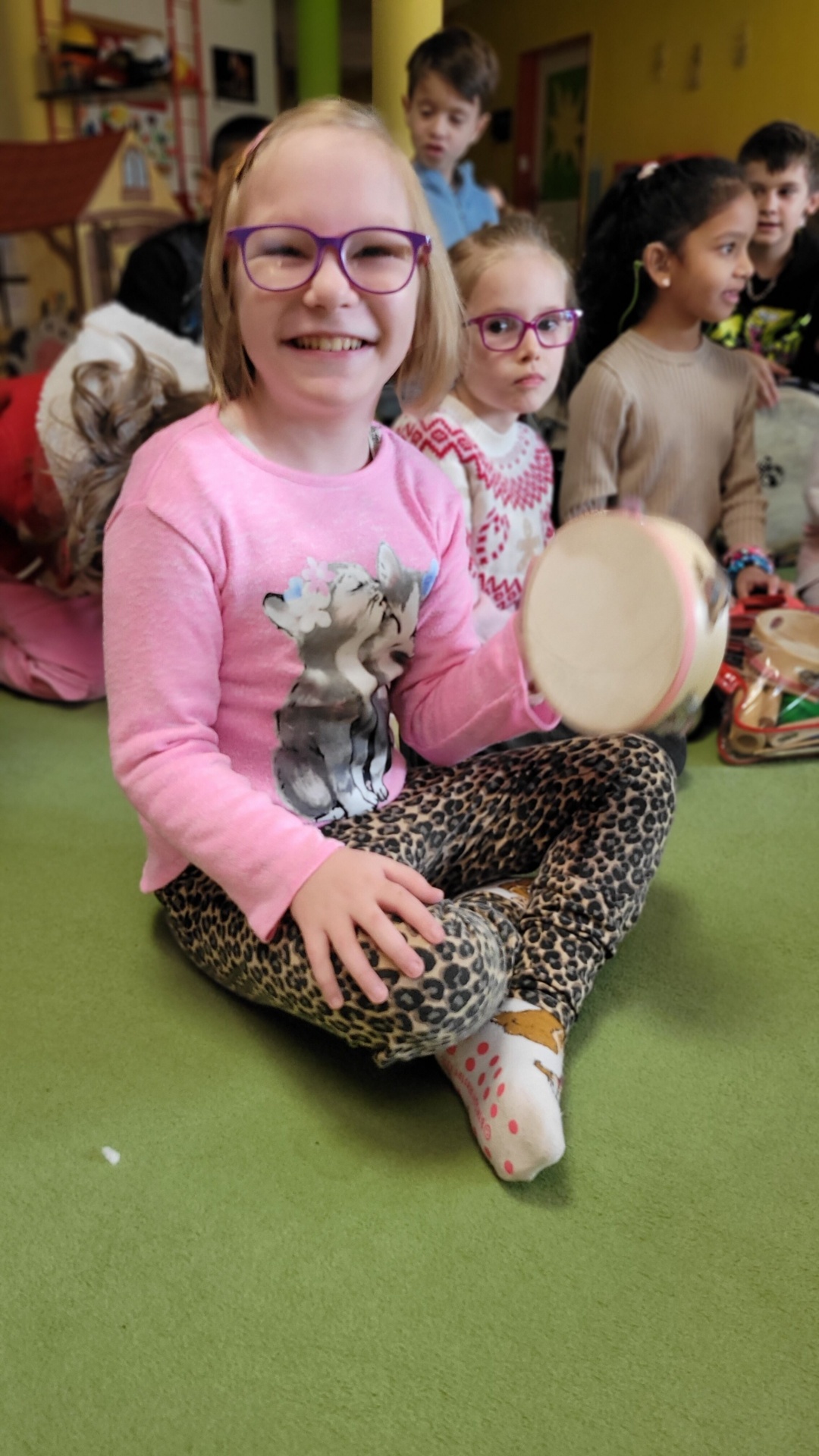 Velký den však nastal ve středu 19. 11. 2025 v 9:00 hod. Děti i žáci byli rozděleni do čtyř skupin: MŠ, I. stupeň ZŠ, II. stupeň ZŠ, SŠ a připojili se k nám dokonce i studenti, kteří u nás vykonávali praxi. V příjemném prostředí MŠ jsme se vrátili k příběhu Tonyho a Týnky, pustili si krátké video, zahráli jsme scénky, naučili se signál pomoci a dokonce jsme tančili bulharský tanec „Ljube, ljube“, který pomáhá z těla odstranit přebytečnou agresi a napětí. Na závěr jsme si společné pod taktovkou jednoho nebo dvou dirigentů zabubnovali.