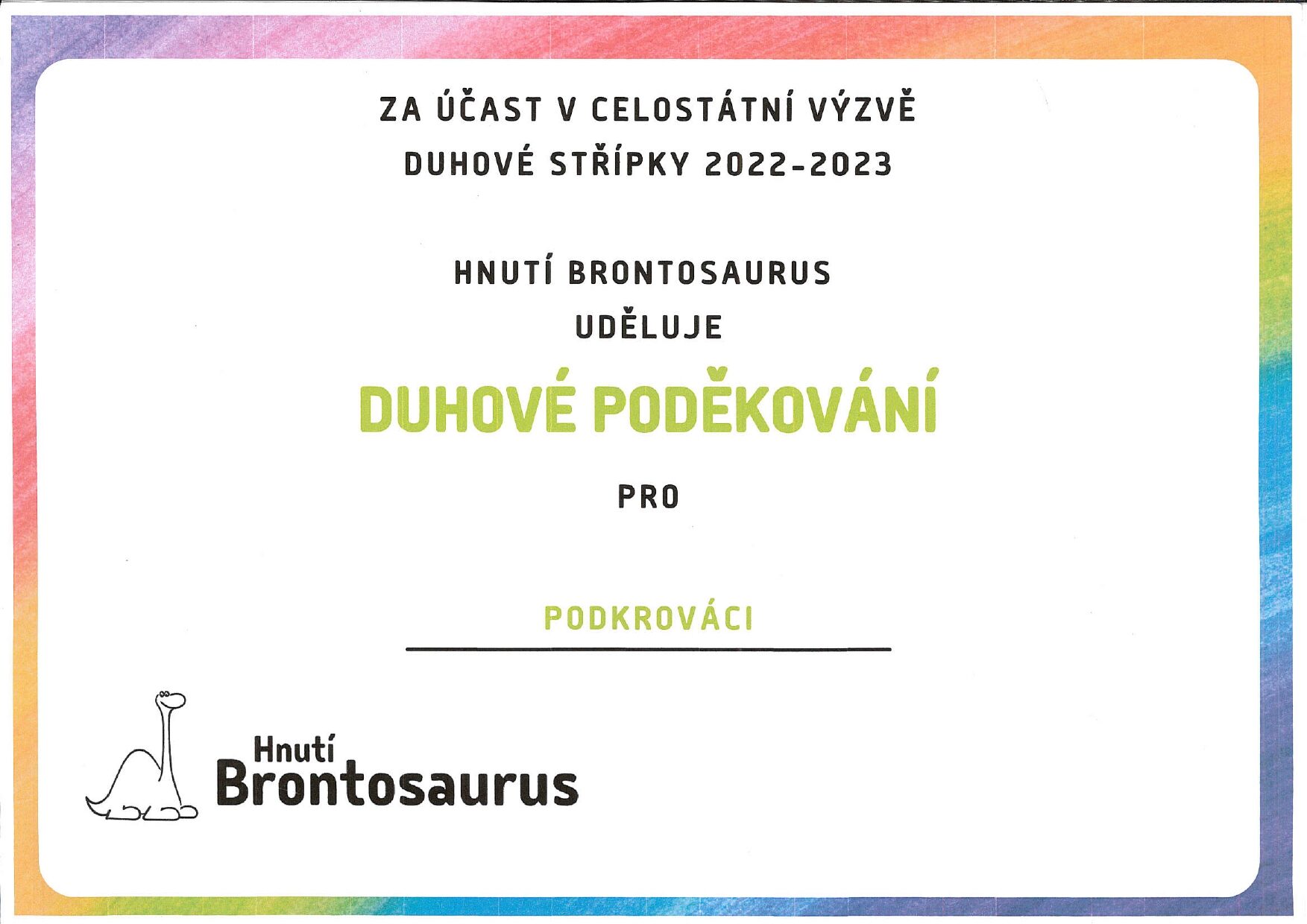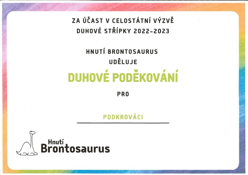 01. 06. 2023V letošním školním roce 2022/2023 jsme se s dětmi z podkrovní družiny přihlásili do Duhových střípků, které nesly téma „Ekostopa“. Náš tým jsme pojmenovali „Podkrováci“. Splnili jsme celkem čtyři výzvy: