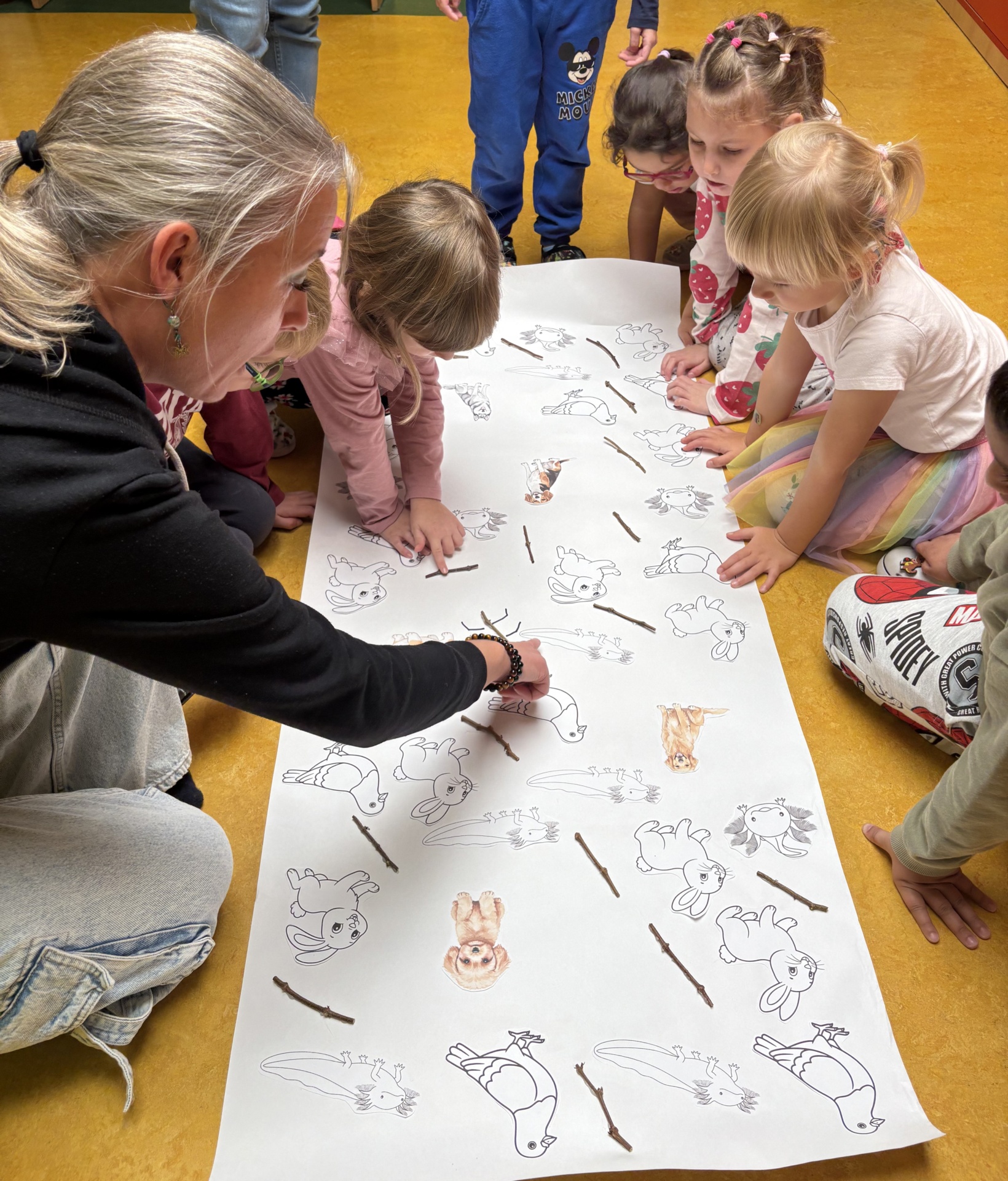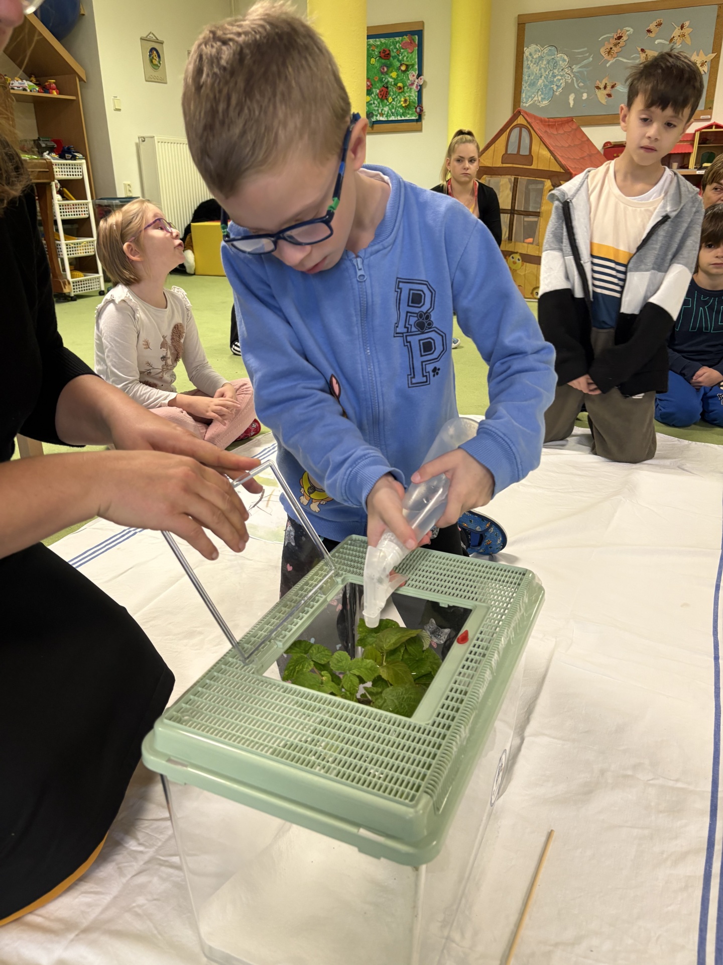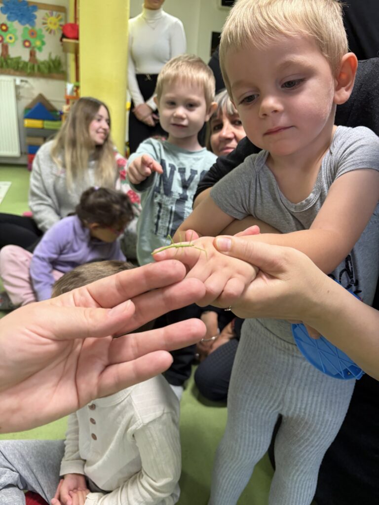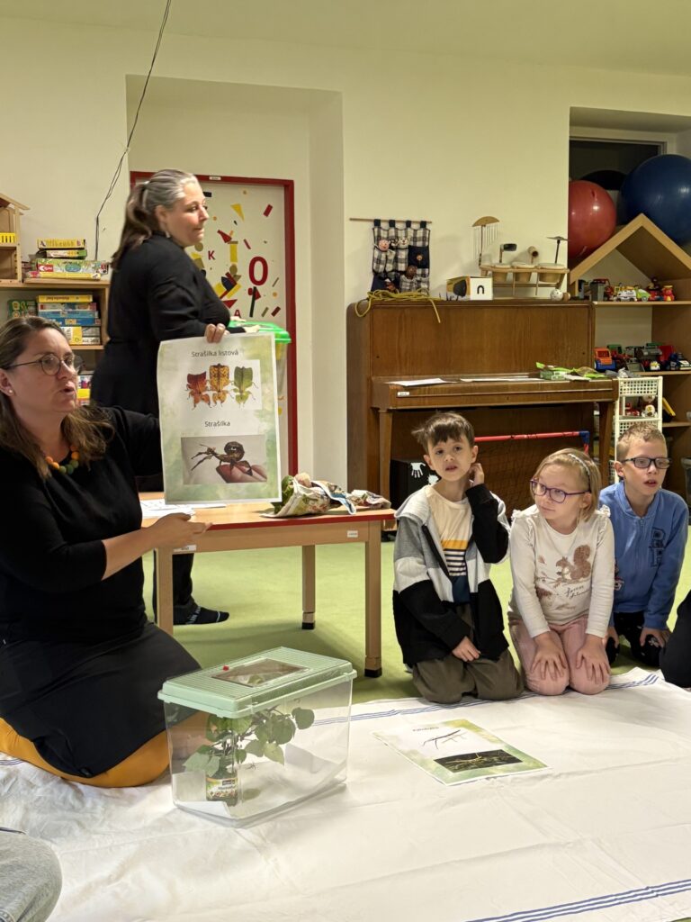 Prvního zvířecího hosta nám pod vedením paní učitelky Lenky Šmerdové přišli představit žáci ze třídy II.A naší základní školy.  Díky mladším žákům se i nejmenší děti dověděly něco o chovu drobného hmyzu. Strašilky a lupenitky byly v malinovém listoví dětmi nejen odhaleny, ale ti nejodvážnější si je statečně nechali dát na ruku. Největším překvapením se však stala malá strašilka Julinka, kterou jsme od žáků dostali jako nečekaný dárek.