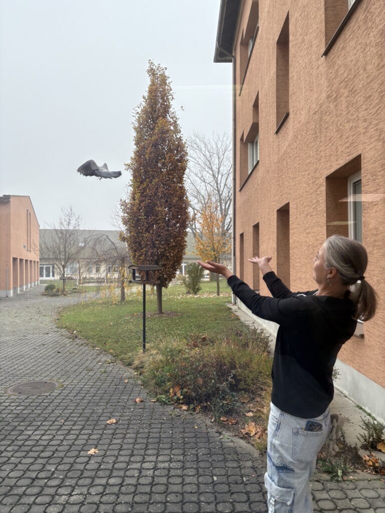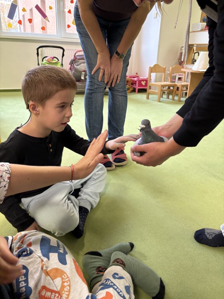o chovu a výcviku holubů na závody. Děti mohly obdivovat vítězné poháry a ocenění. Prohlédly si perutě jeho křídel i holubí vejce. Také mohly porovnat velikosti s vejcem slepičím a pštrosím. Největším zážitkem bylo vypuštění holuba, kdy děti ani nedutaly. Jeho šťastný návrat domů již máme potvrzen.J