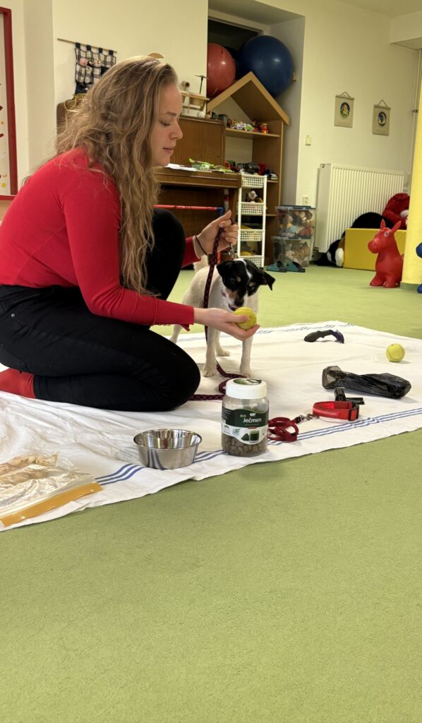 Další zvířecí host byl o něco větší a chlupatější. Fenka Ajka s majitelkou Kristýnkou nám ukázaly vše potřebné k chovu a výcviku psů, jako je vodítko, misky, obojek, granule