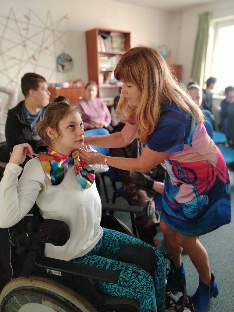 V druhé části programu paní Alena Ciková osobně předala jeden ze svých šátků naší studentce Leoně Pochopové. Nadační fond školy tímto šátkem chtěl vyjádřit Leonce poděkování za její obraz, který věnovala Nadačnímu fondu školy. Obraz byl vydražen na školním plese za krásných 5 000 Kč.