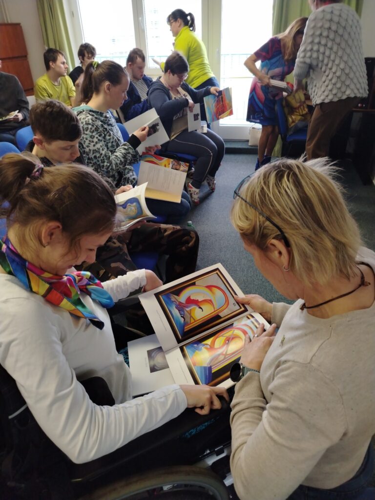 Její obrazy jsou plné energie, barev, postav, andělů. Měli jsme možnost zhlédnout i videa z módních přehlídek. Alena Ciková působí jako malířka po celém světě. Přinesla nám ukázat ručník, šátek, pouzdro, kde jsou přeneseny její krásné obrazy na látku. Povídala nám o svých jednotlivých obrazech, které nám promítala na interaktivní tabuli.