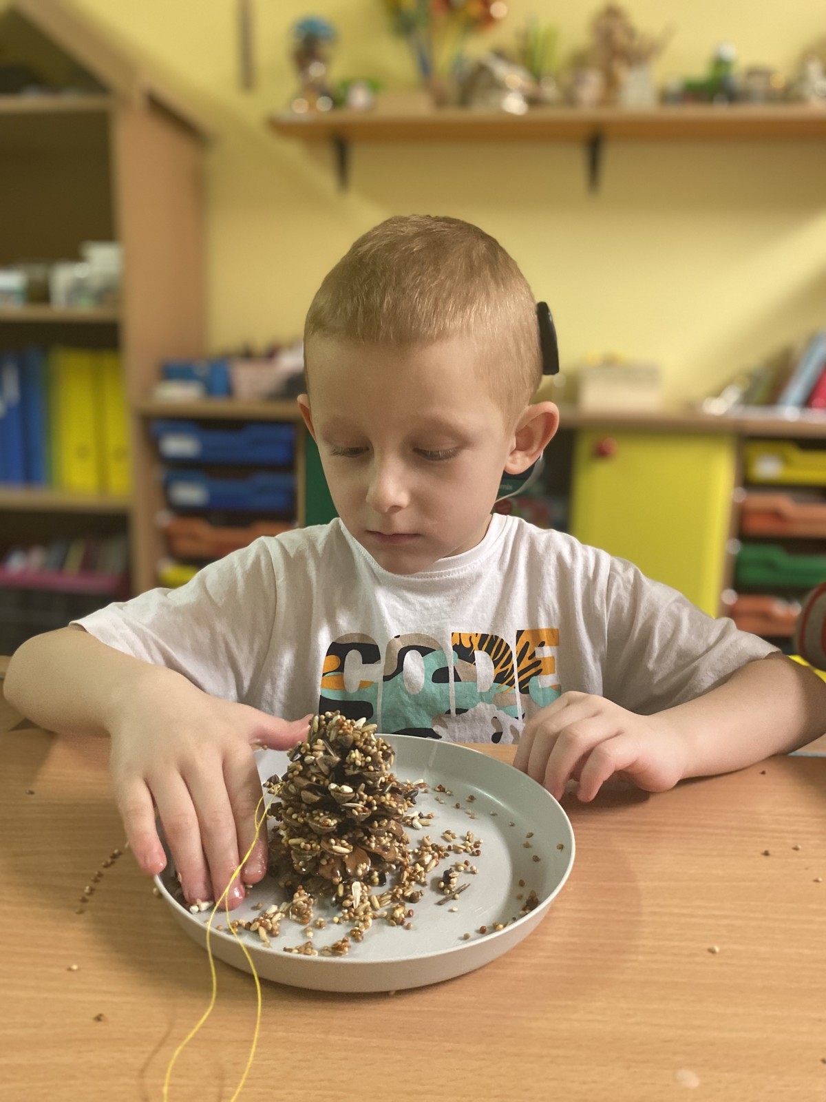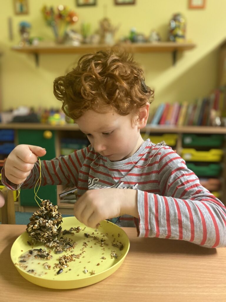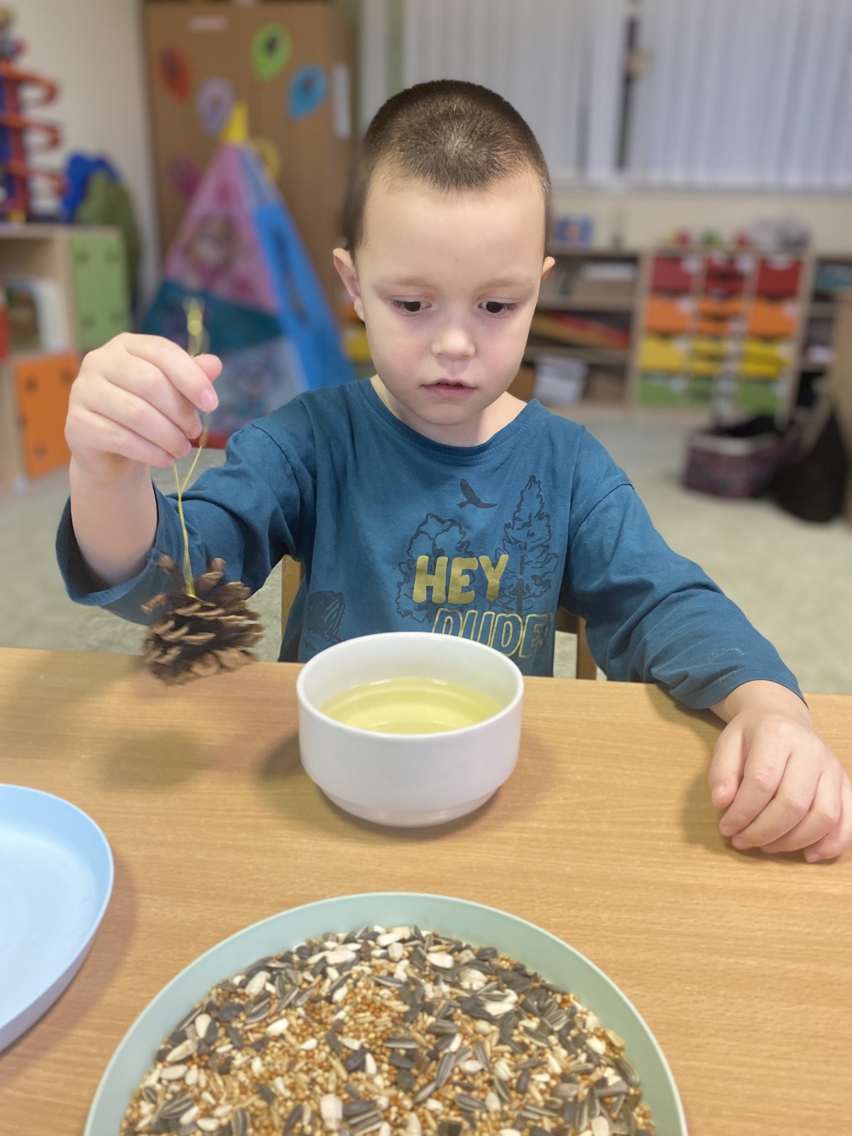 Nakonec děti pomohly ptáčkům tím, že vytvořily krmítka ze šišek obalených semínky. Během vycházky pak děti vybraly místo, kde pověsily svá vlastnoručně vyrobená krmítka.