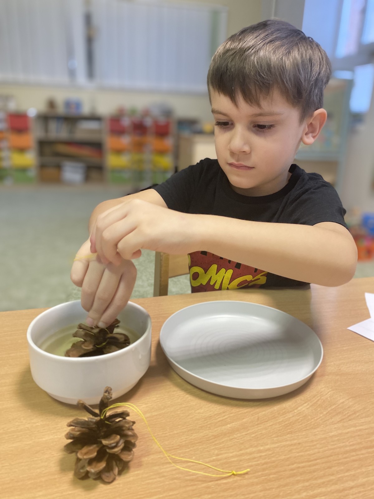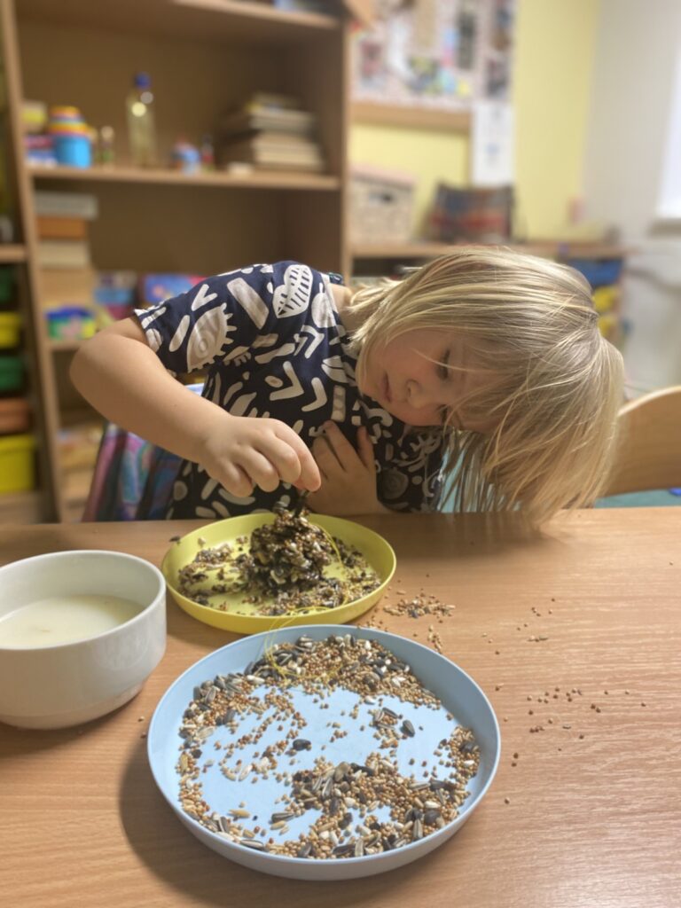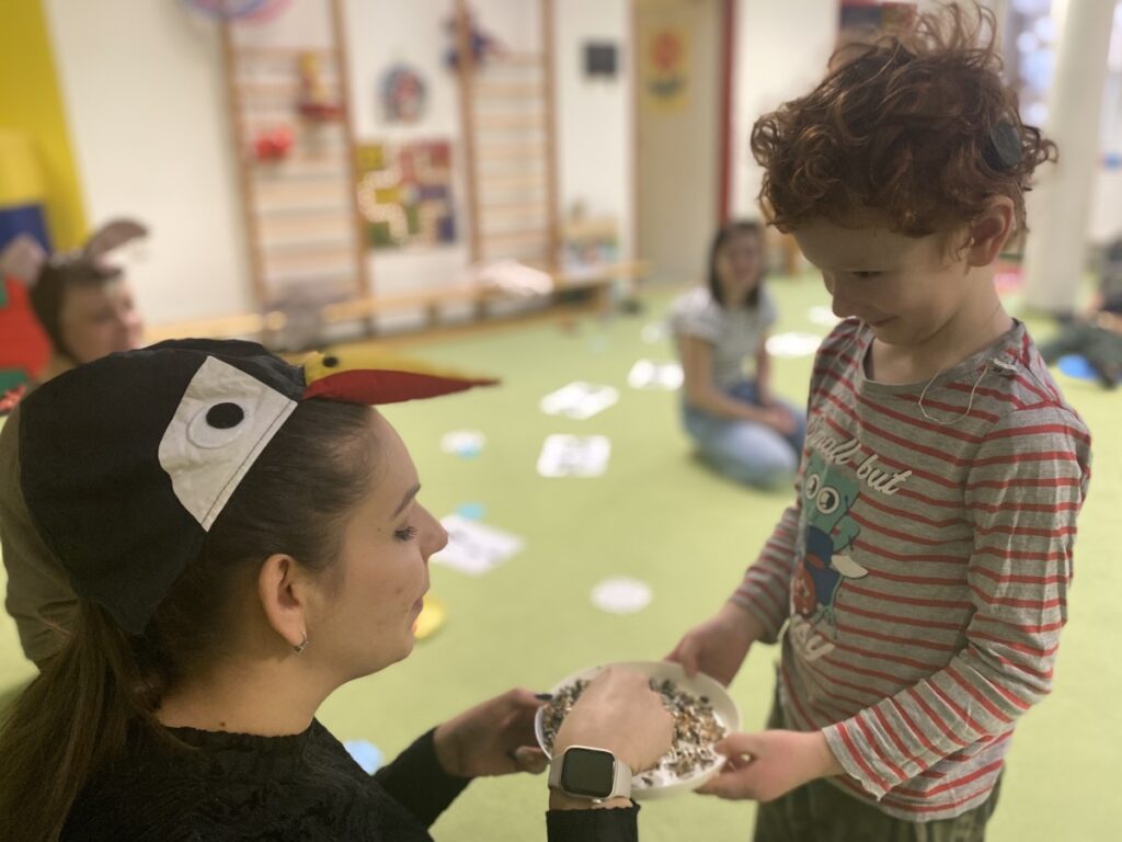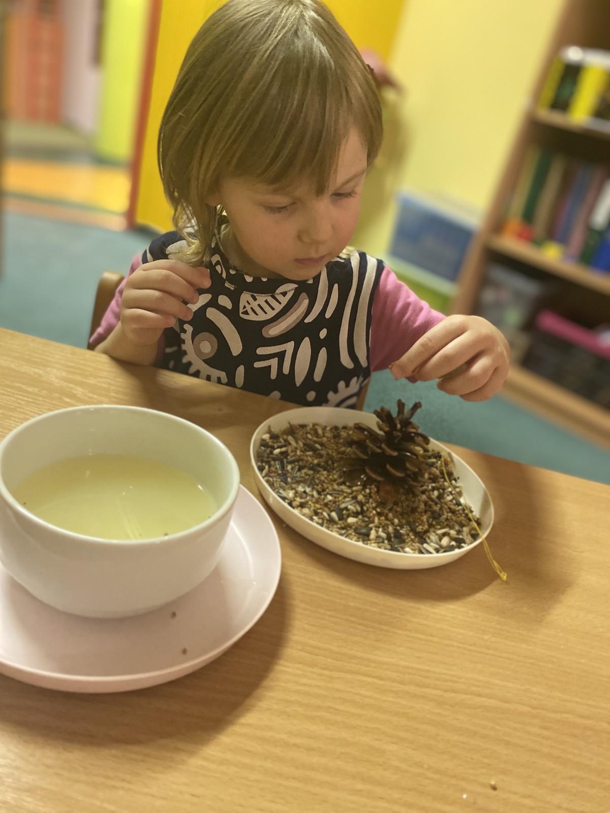 Nakonec děti pomohly ptáčkům tím, že vytvořily krmítka ze šišek obalených semínky. Během vycházky pak děti vybraly místo, kde pověsily svá vlastnoručně vyrobená krmítka.