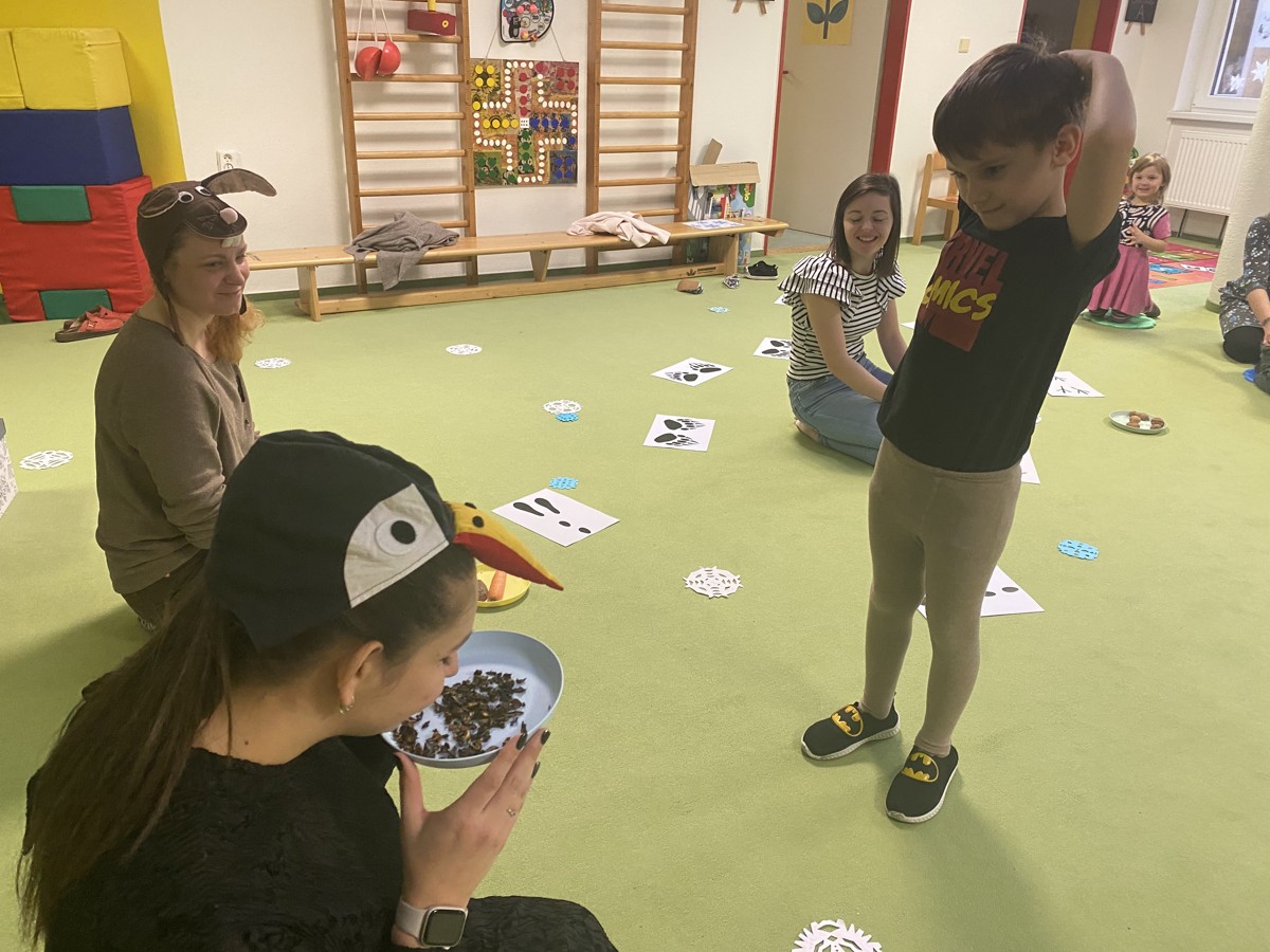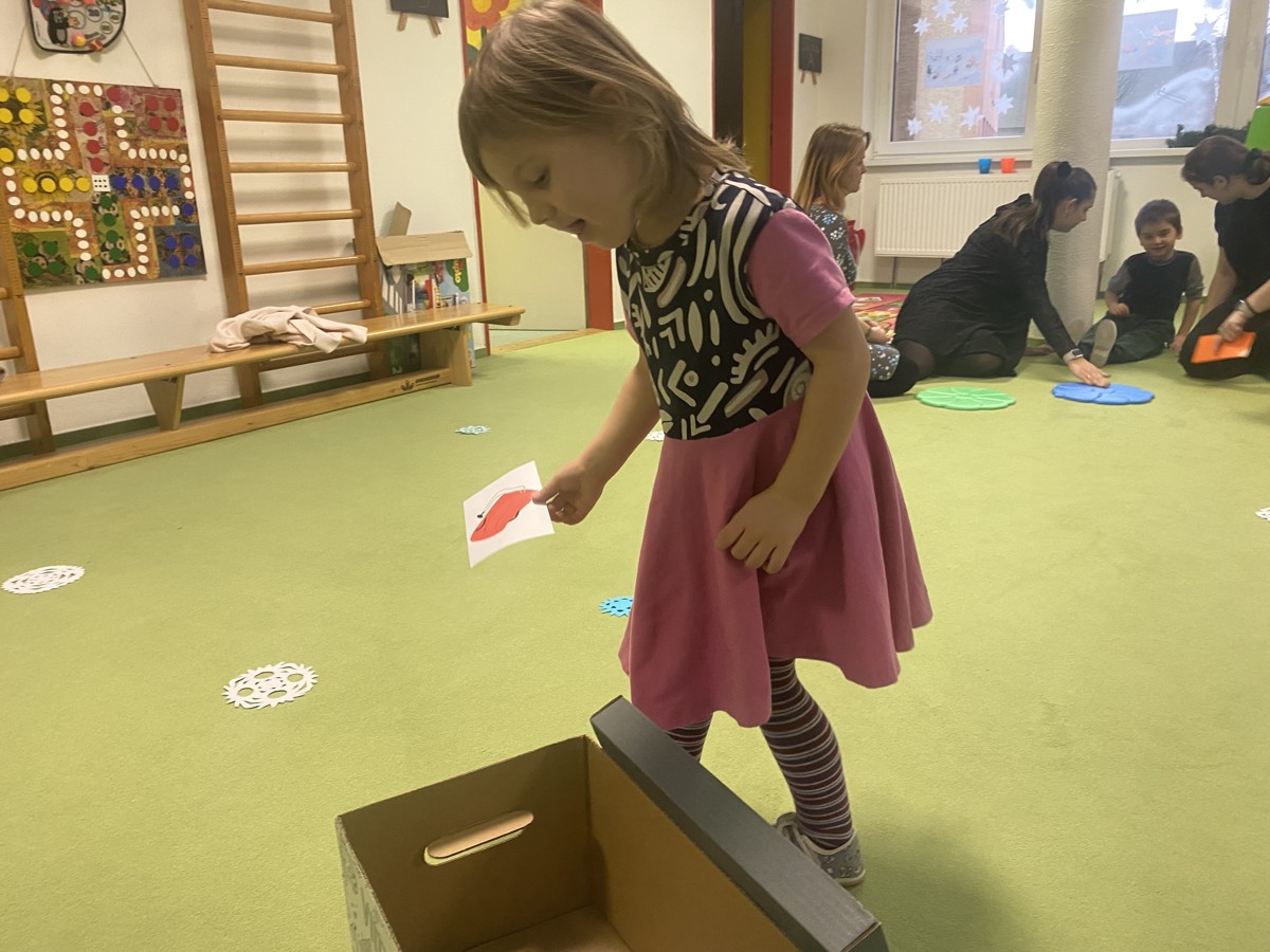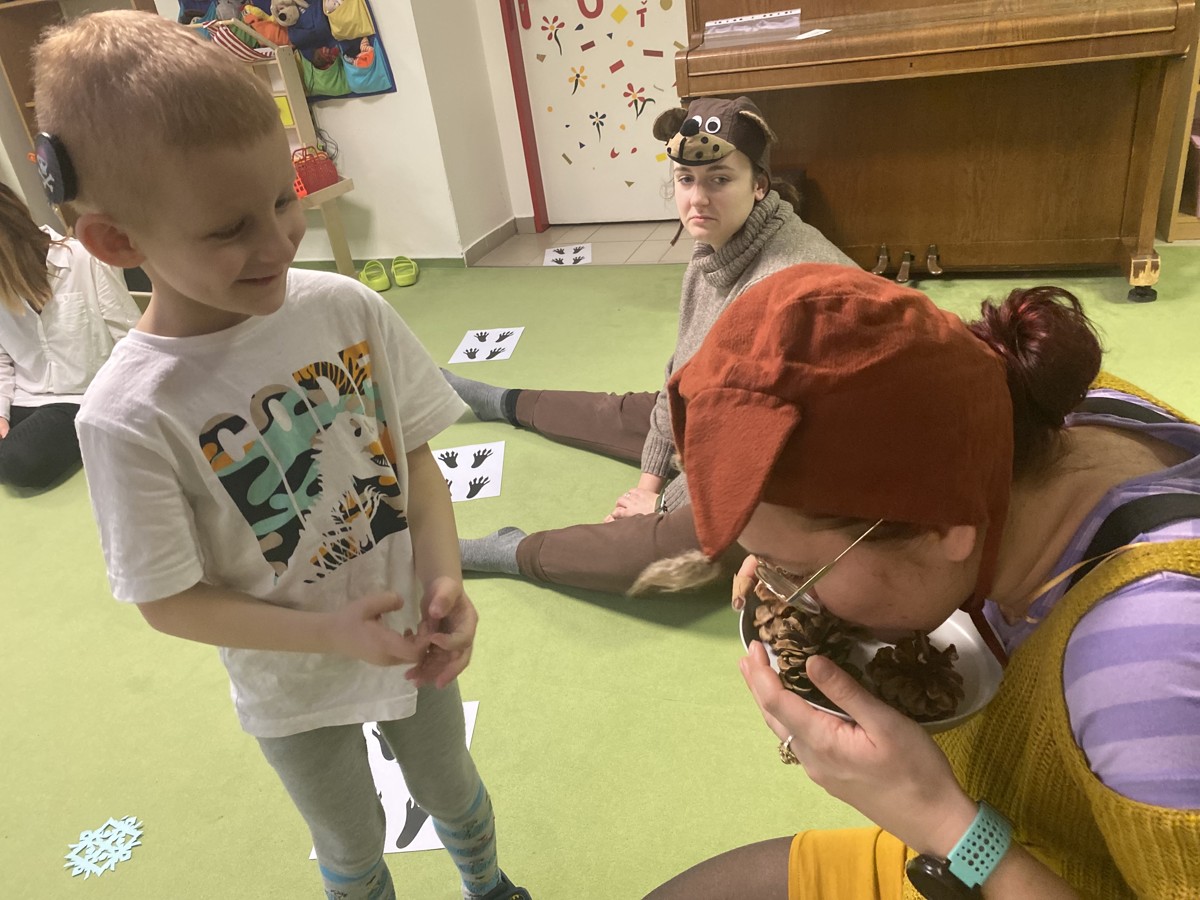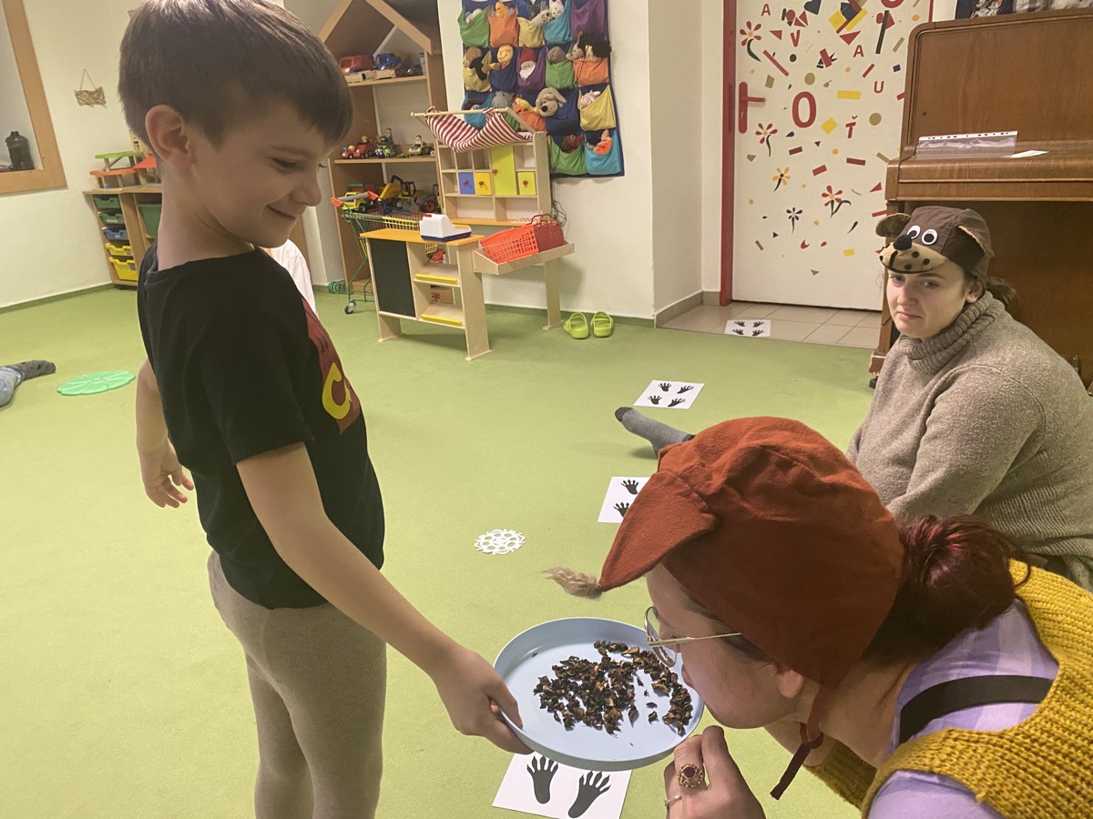 Děti si hravou formou vyzkoušely, co se děje s ledem, když se zahřívá. Společně roztřídily obrázky spojené se zimou a teplem, identifikovaly stopy medvěda, veverky, ptáčka a zajíce. Také se dozvěděly, co tato zvířata jedí v zimě, a jak jim můžeme pomoci, aby měla dostatek potravy. Odhalili jsme také tajemství, jak medvěd přežívá zimu, a vyzkoušeli si na něj zahrát při pohybové hře.