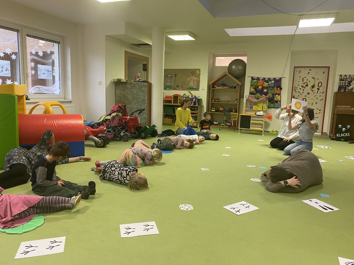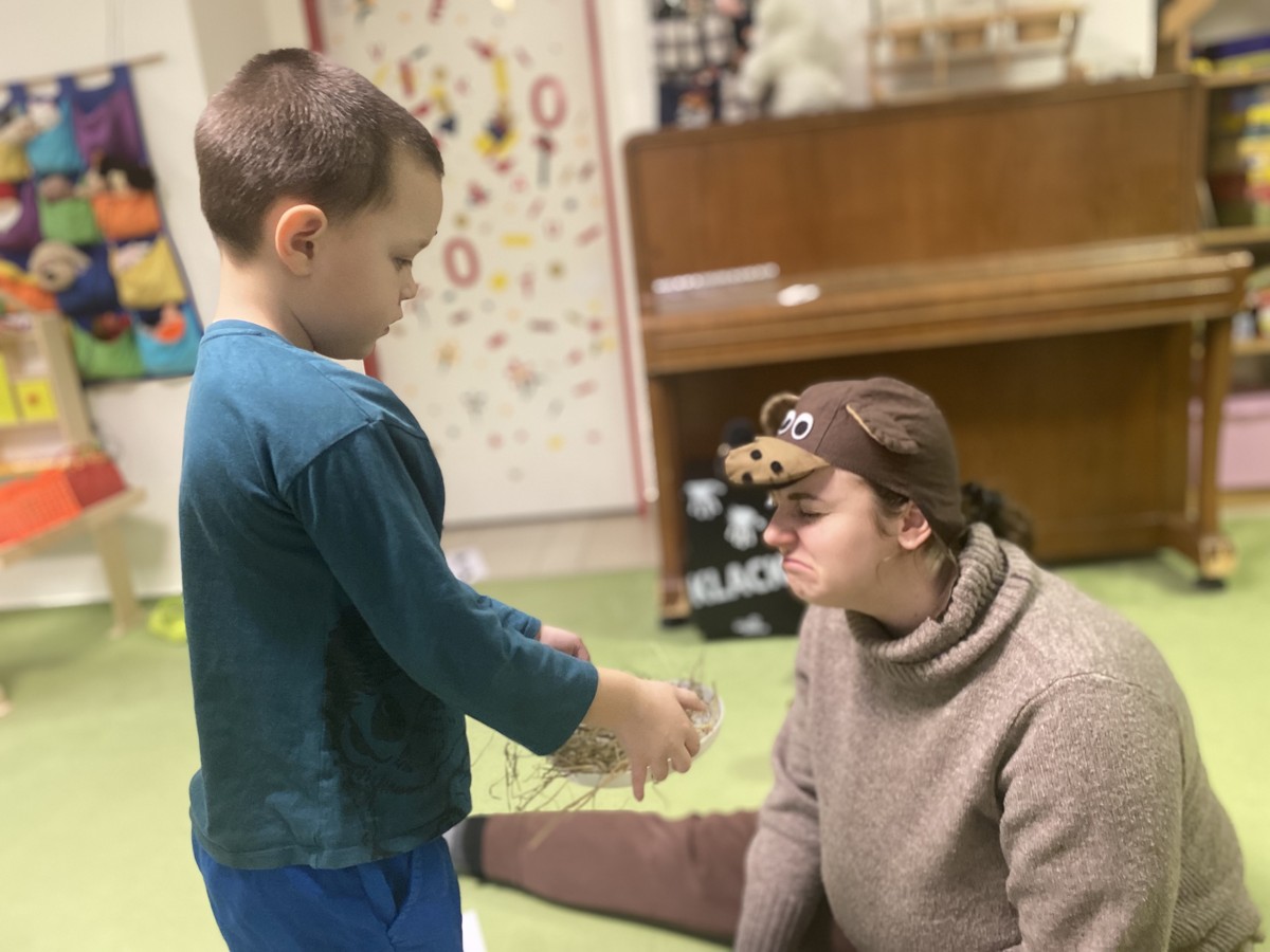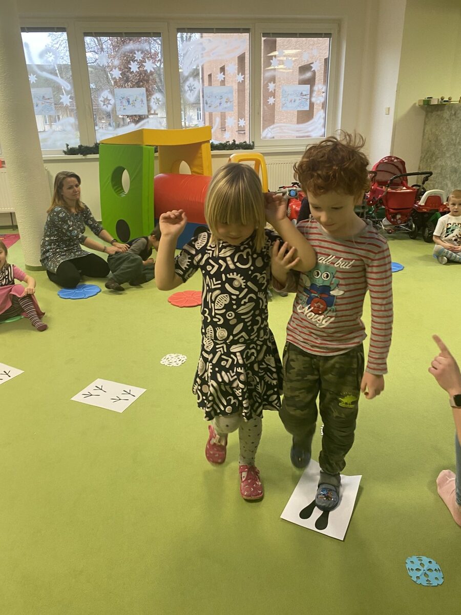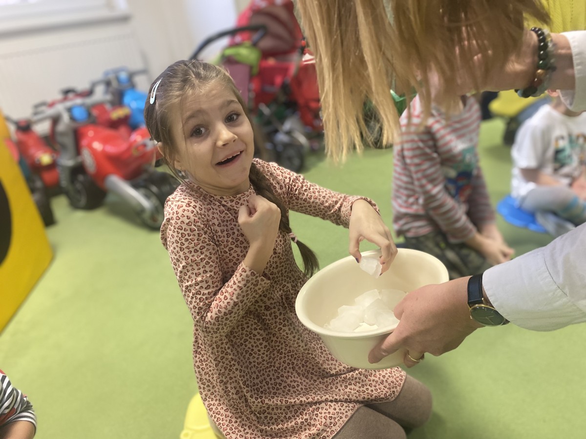 Děti si hravou formou vyzkoušely, co se děje s ledem, když se zahřívá. Společně roztřídily obrázky spojené se zimou a teplem, identifikovaly stopy medvěda, veverky, ptáčka a zajíce. Také se dozvěděly, co tato zvířata jedí v zimě, a jak jim můžeme pomoci, aby měla dostatek potravy. Odhalili jsme také tajemství, jak medvěd přežívá zimu, a vyzkoušeli si na něj zahrát při pohybové hře.