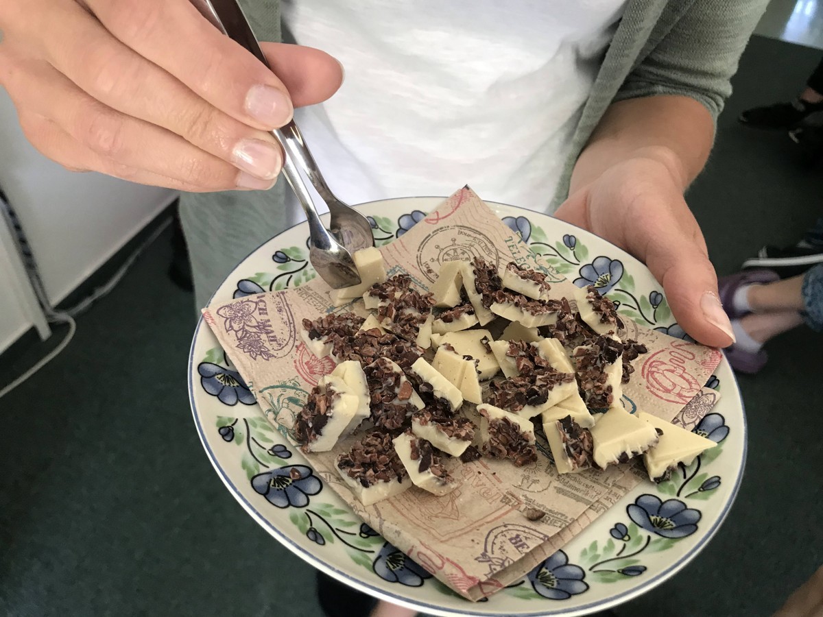 Naše chuťové pohárky byly poškádleny pestrými a překvapujícími příchutěmi mnoha druhů čokolád. V ochutnávce nechyběla mléčná čokoláda, hořká čokoláda, bílá čokoláda s kakaovými boby, maková s citrónem a v nabídce byla i hrášková se slaninou. Ano, i taková může být čokoláda. Během našeho společného povídání jsme zvládli ochutnat více než 10 druhů těchto dobrot. Celá akce probíhala v přátelské atmosféře a věřím, že všechny mlsné jazýčky si přišly na své.