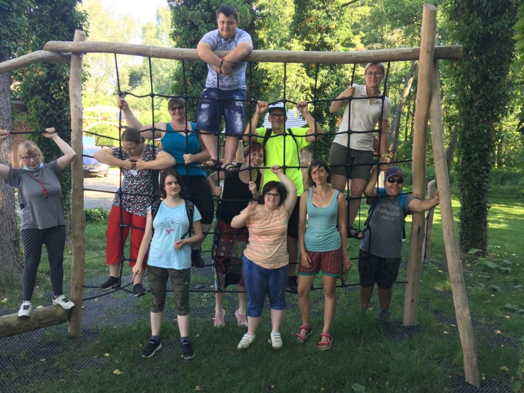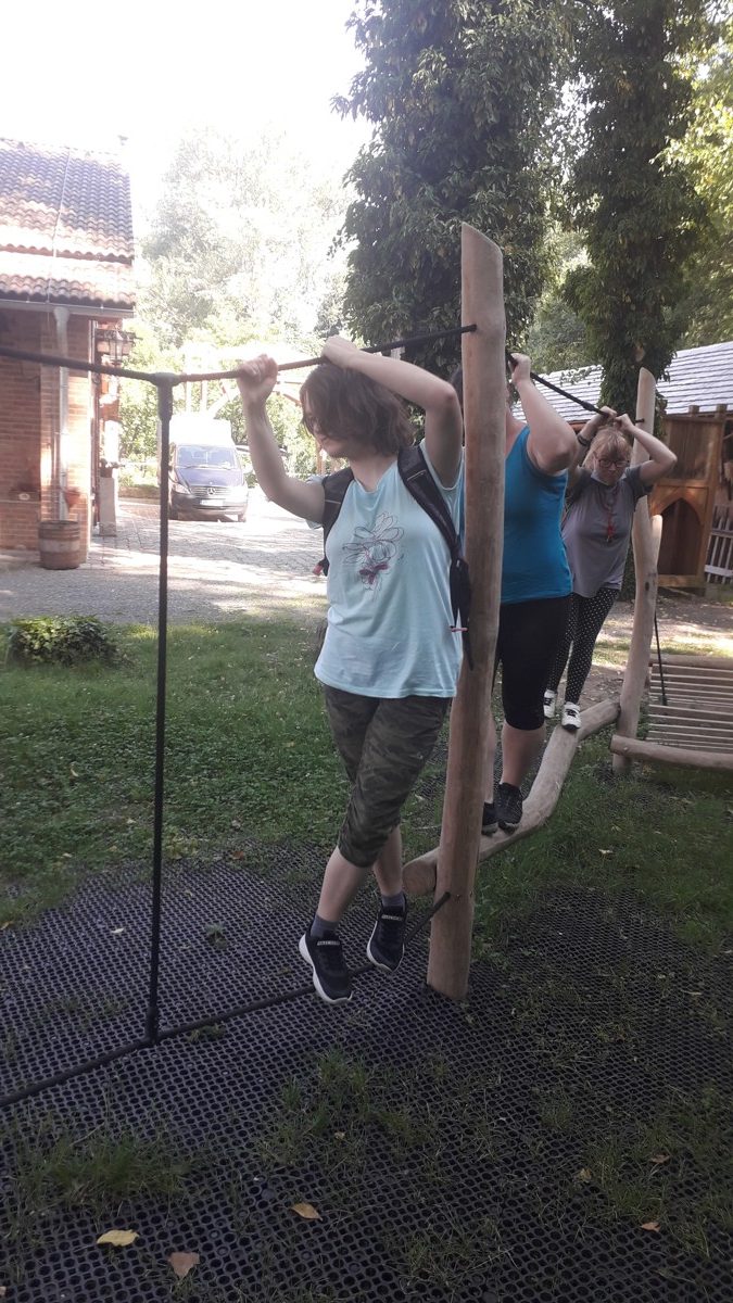 Naše první neplánovaná zastávka byla na krásném dřevěném hřišti, kde jsme si vyzkoušeli různé druhy překážek a průlezek.