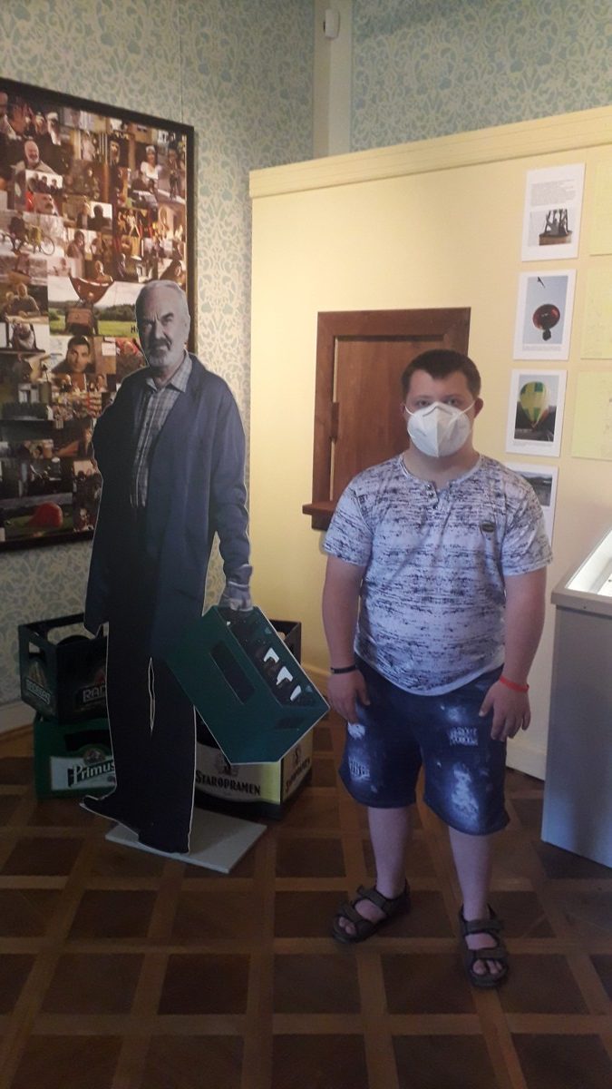 Poté jsme navštívili filmové muzeum Zdeňka a Jana Svěrákových, kde jsme měli možnost prohlédnout si expozice zaměřené na filmy: Kolja, Tři Bratři, Obecná škola, Vratné láhve, Kuky se vrací apod. Vyfotili jsme se s papírovým Zdeňkem Svěrákem, Igorem Hnízdem nebo vlkem.
