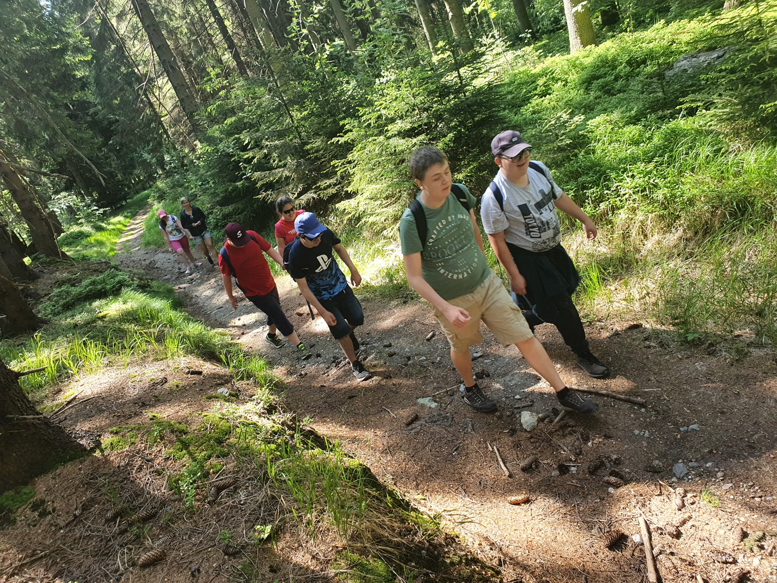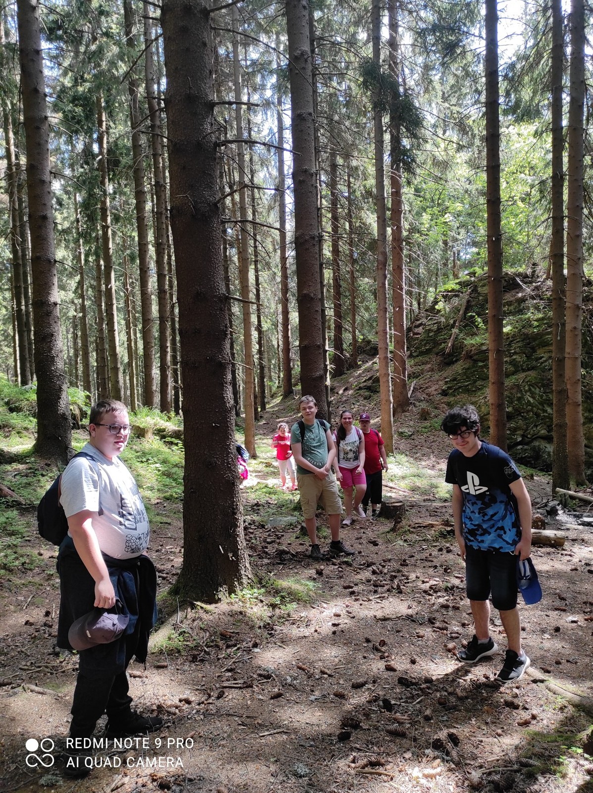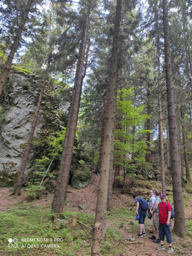Trasa byla krásná, ale zároveň i náročná. Velký kus cesty jsme šlapali do kopce, místy jsme opravdu skoro lezli po čtyřech. Ale odměnou nám pak bylo, že jsme viděli staré hornické štoly a dostali jsme se na krásné místo, jako vystřižené z pohádky. Byly to zajímavé skalní útvary a nás všechny hned shodně napadlo, že by to byl parádní úkryt pro loupežníky. Pravé loupežnické doupě.