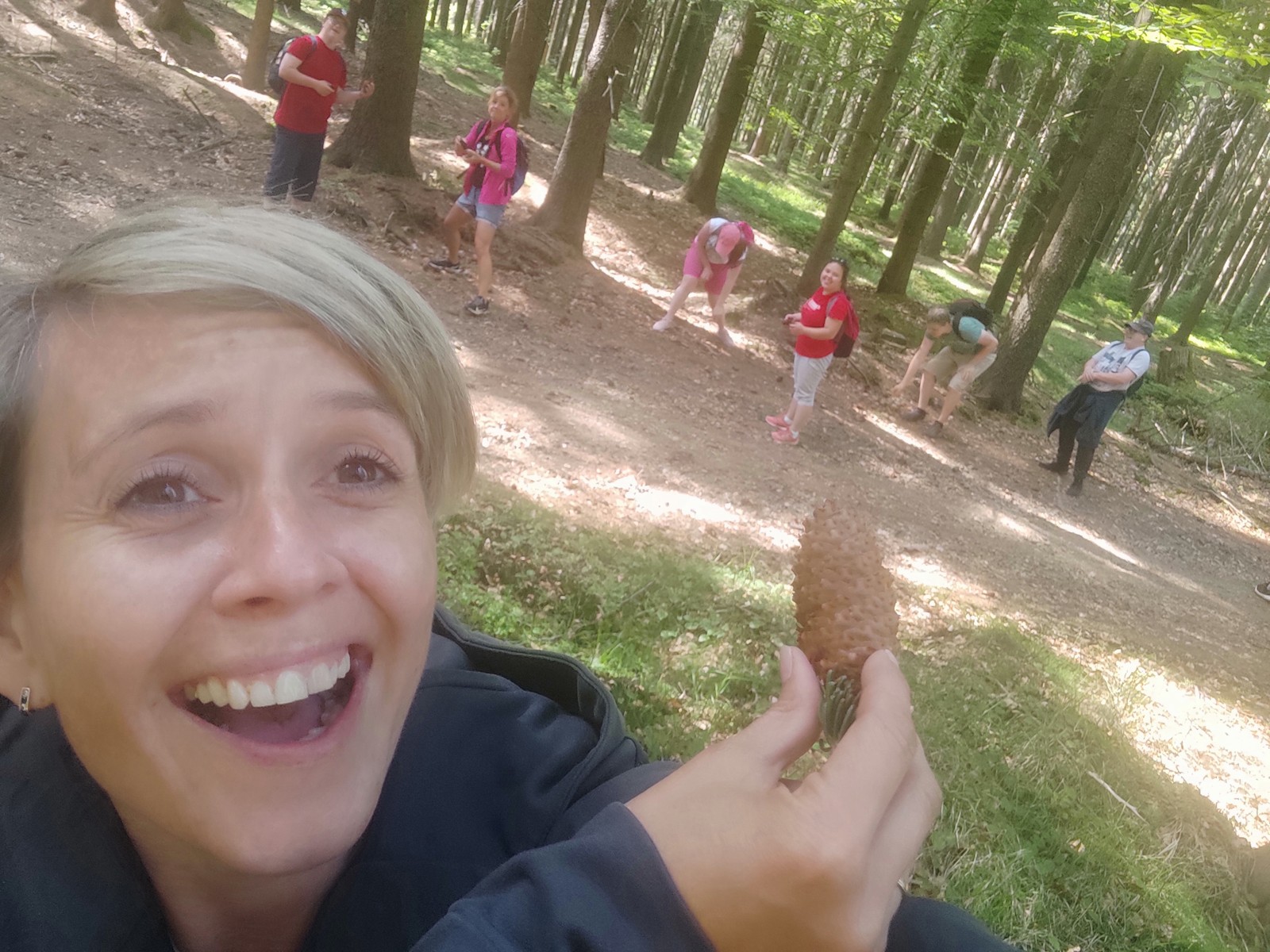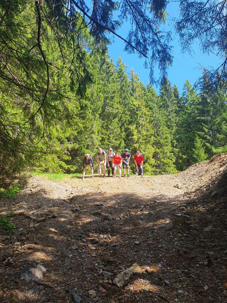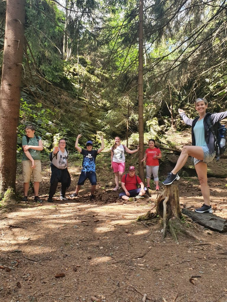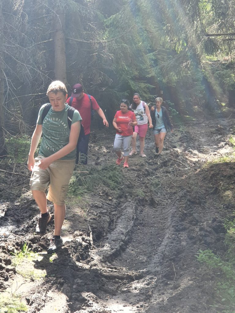 Trasa byla krásná, ale zároveň i náročná. Velký kus cesty jsme šlapali do kopce, místy jsme opravdu skoro lezli po čtyřech. Ale odměnou nám pak bylo, že jsme viděli staré hornické štoly a dostali jsme se na krásné místo, jako vystřižené z pohádky. Byly to zajímavé skalní útvary a nás všechny hned shodně napadlo, že by to byl parádní úkryt pro loupežníky. Pravé loupežnické doupě.