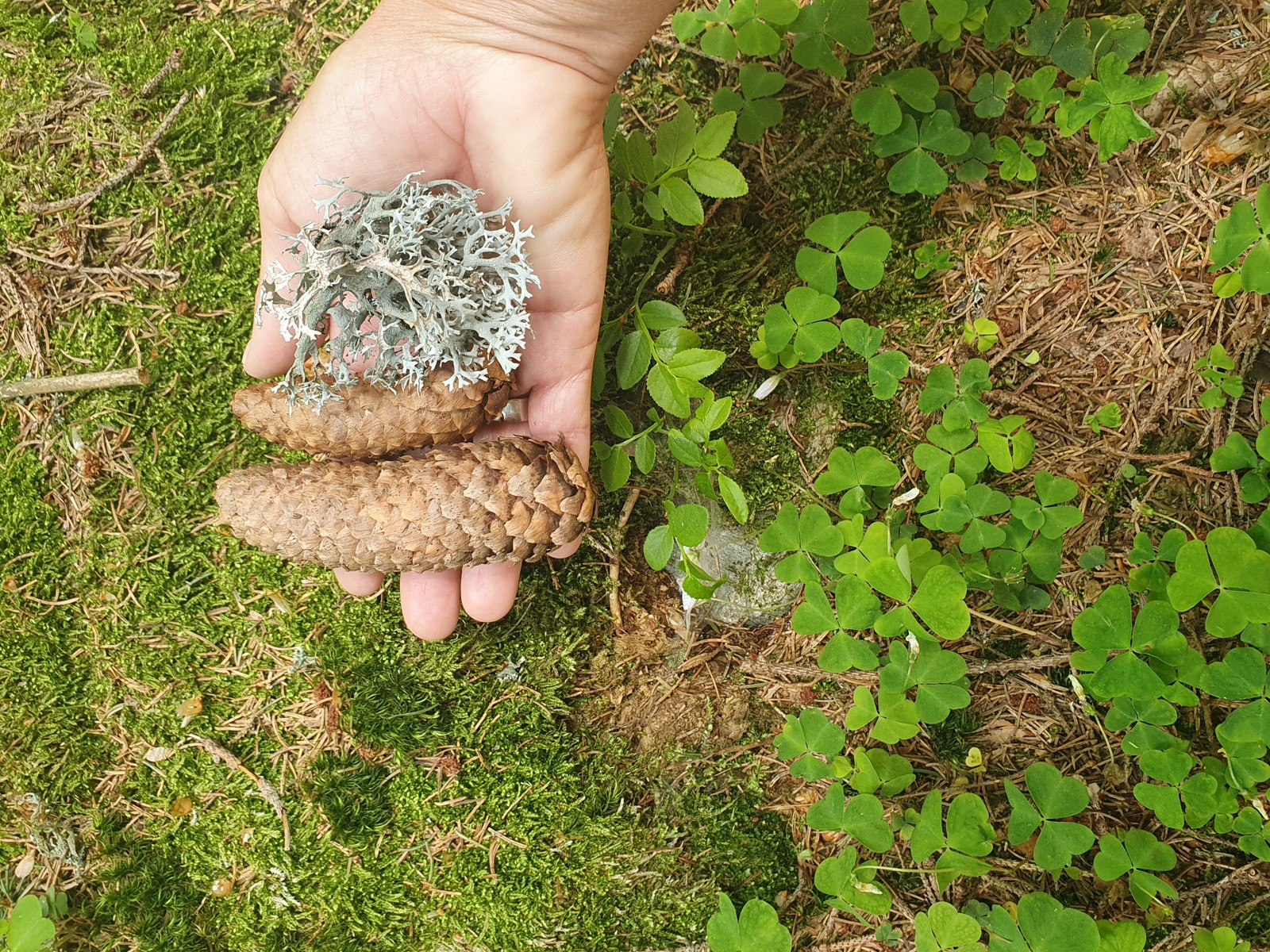 Počasí bylo jako vymalované, dokonale modrá obloha, sem tam bílý mráček, teplota 23°C. No prostě dokonalé podmínky na turistiku. A tak jsme šlapali a šlapali a po cestě jsme se kochali krásami zdejší přírody. Tu hromady šišek, tu spousty krásných lišejníků, mechové paloučky, sametová tráva, lány borůvčí… Škoda jen, že zatím nebyly borůvky zralé. Přijít sem tak za 2 týdny, byla by to pořádná hostina.