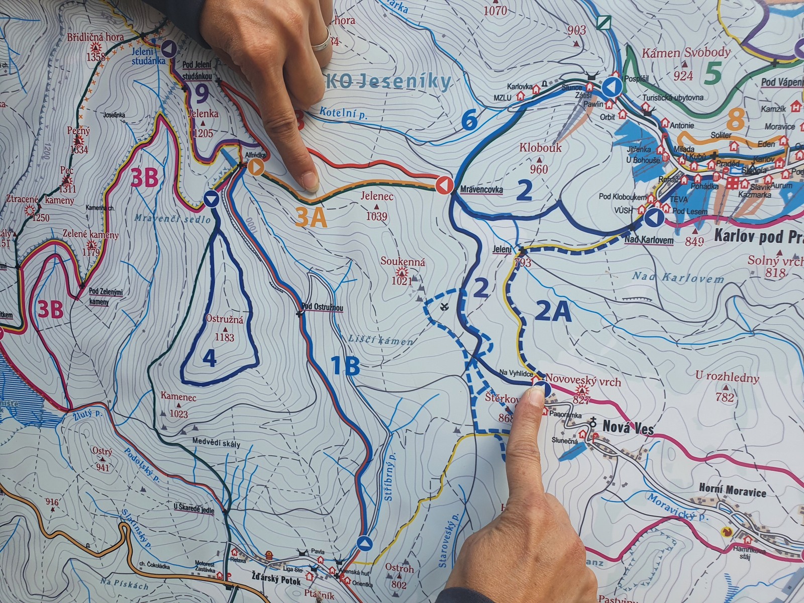 Funěli jsme už všichni, ale šlapali jsme statečně dál. Navíc jsme se ještě museli vypořádat s chůzí po cestě, která byla rozježděná od těžkých lesních strojů. Ale brali jsme to jako překážkovou dráhu v tělocviku. Nic nás nemohlo zastavit. Až jsme se konečně dostali na vrchol kopce Jelenec, odkud byl nádherný výhled na velký kus Jeseníků. Za odměnu jsme si naordinovali svačinku a odpočinek v trávě.