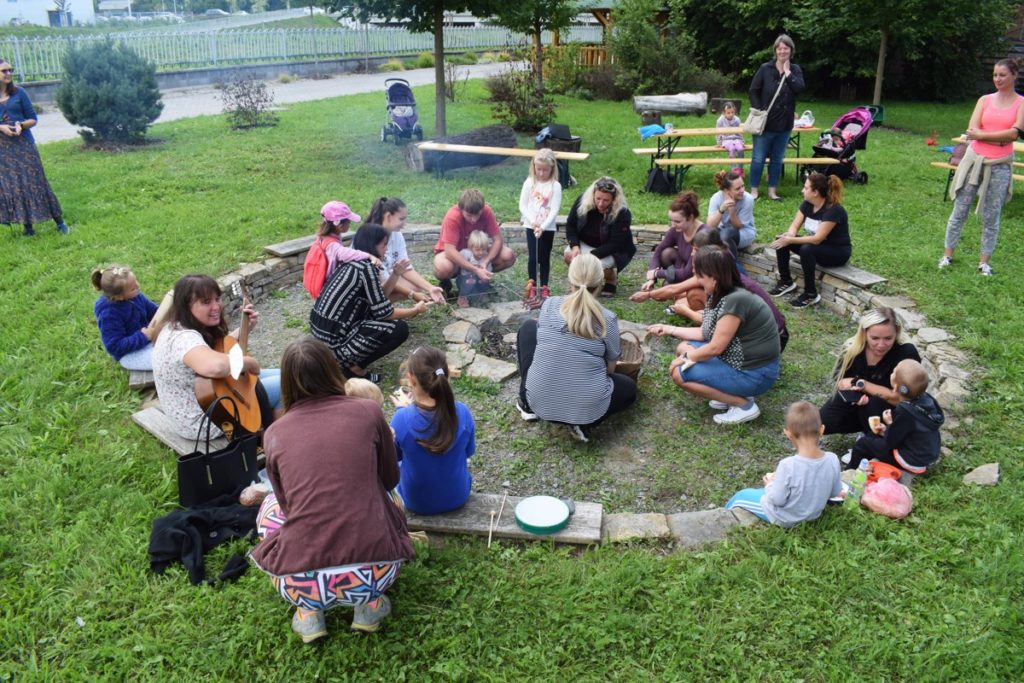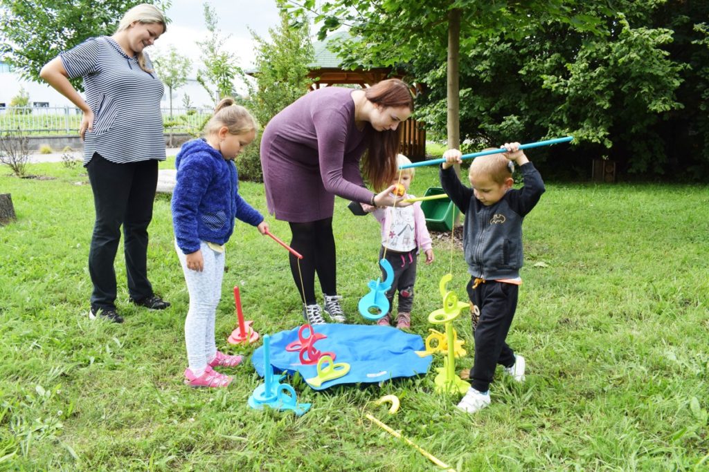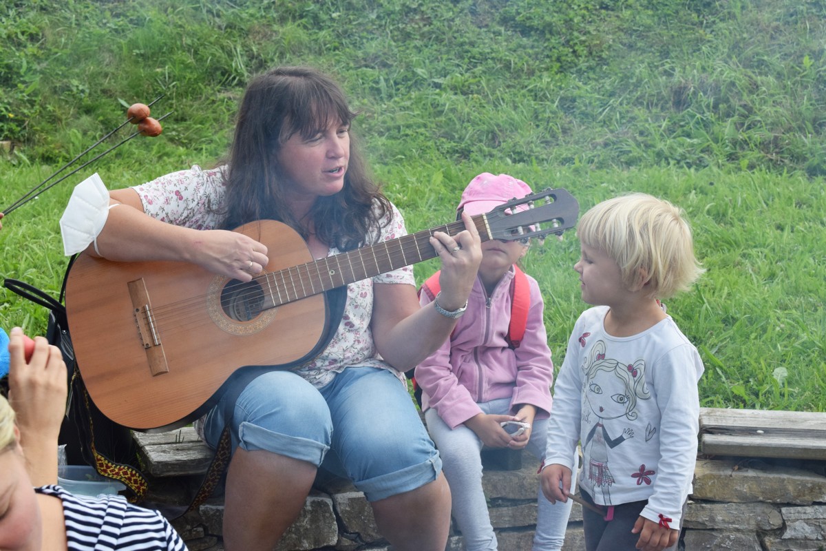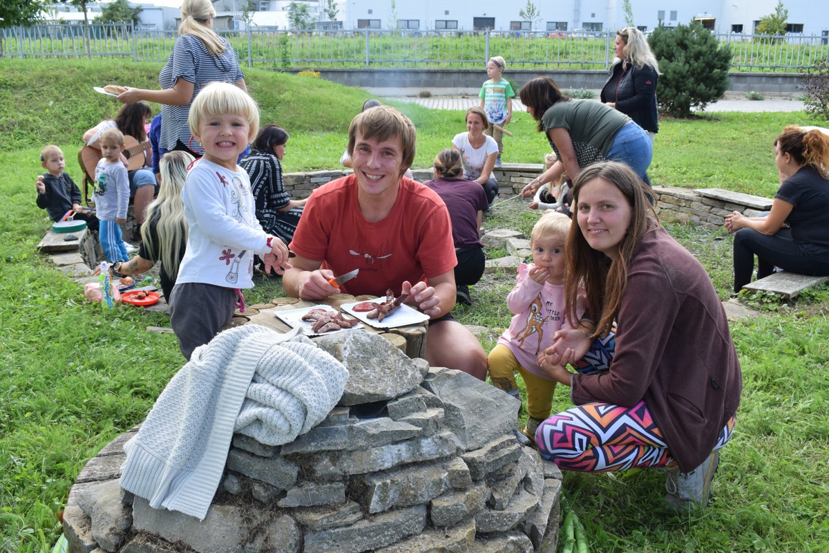 Po chvilce se k rodičům připojily i děti a všechny tety ze školky. Všichni se těšili na opékání špekáčků, při čemž je do provázela kytara, spousta dalších hudebních nástrojů a veselý zpěv dětí i dospělých. Děti spokojeně pobíhaly kolem a vyzkoušely všechny klouzačky, houpačky, kolotoč i trampolínu. Dospělí zase měli čas a možnost se vzájemně poznat a popovídat si. Vše samozřejmě probíhalo za dodržení veškerých hygienických opatření a nařízení.