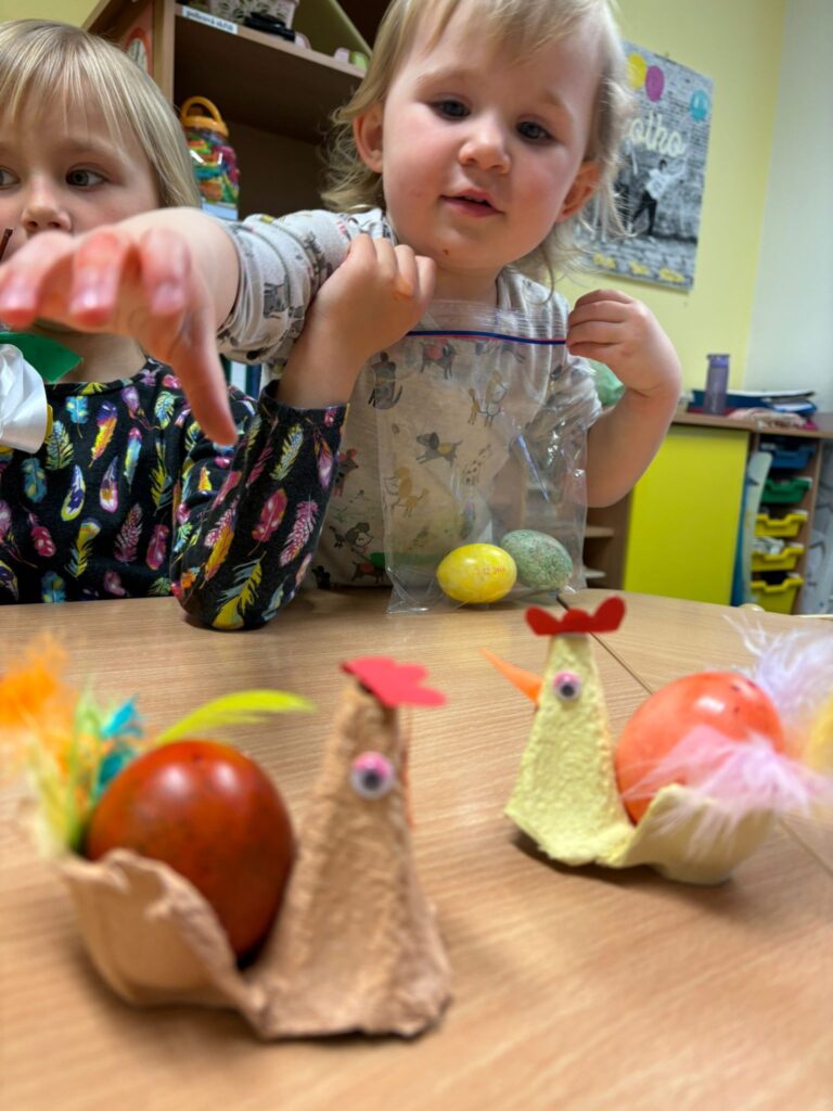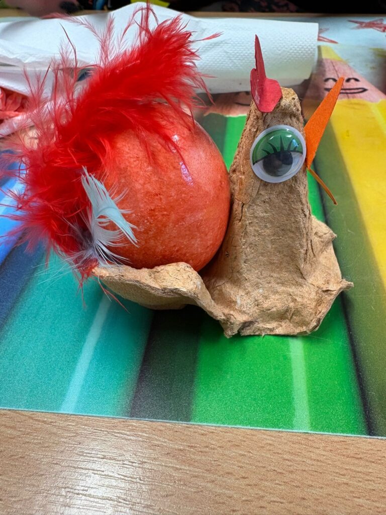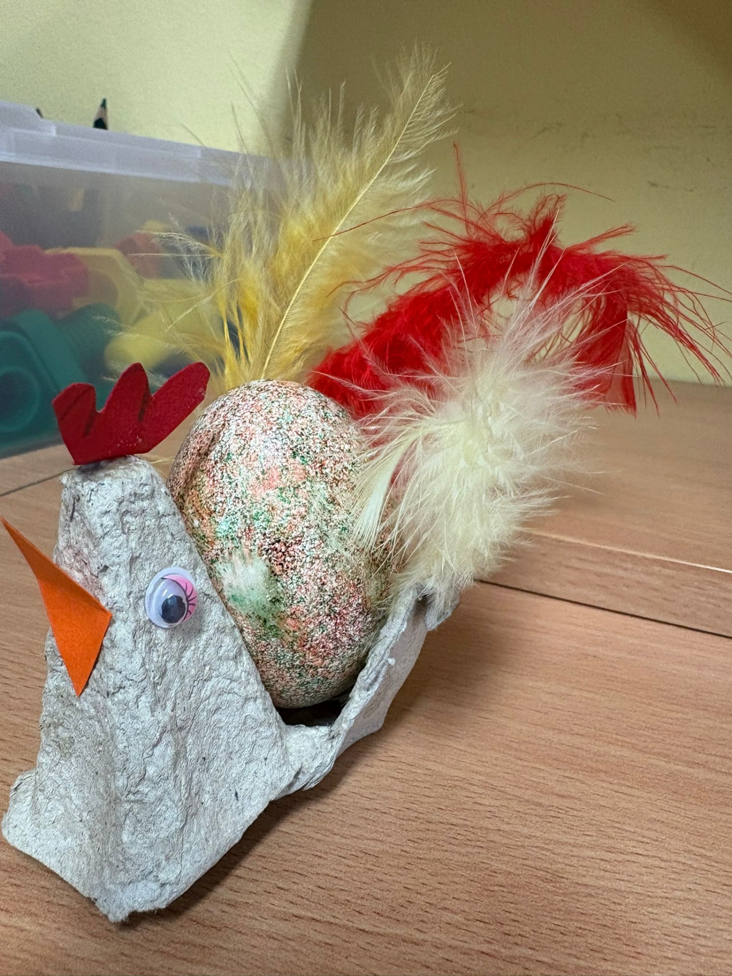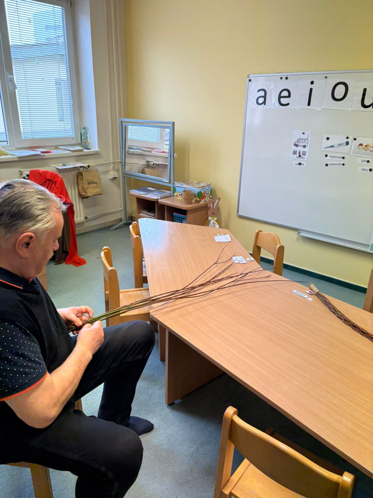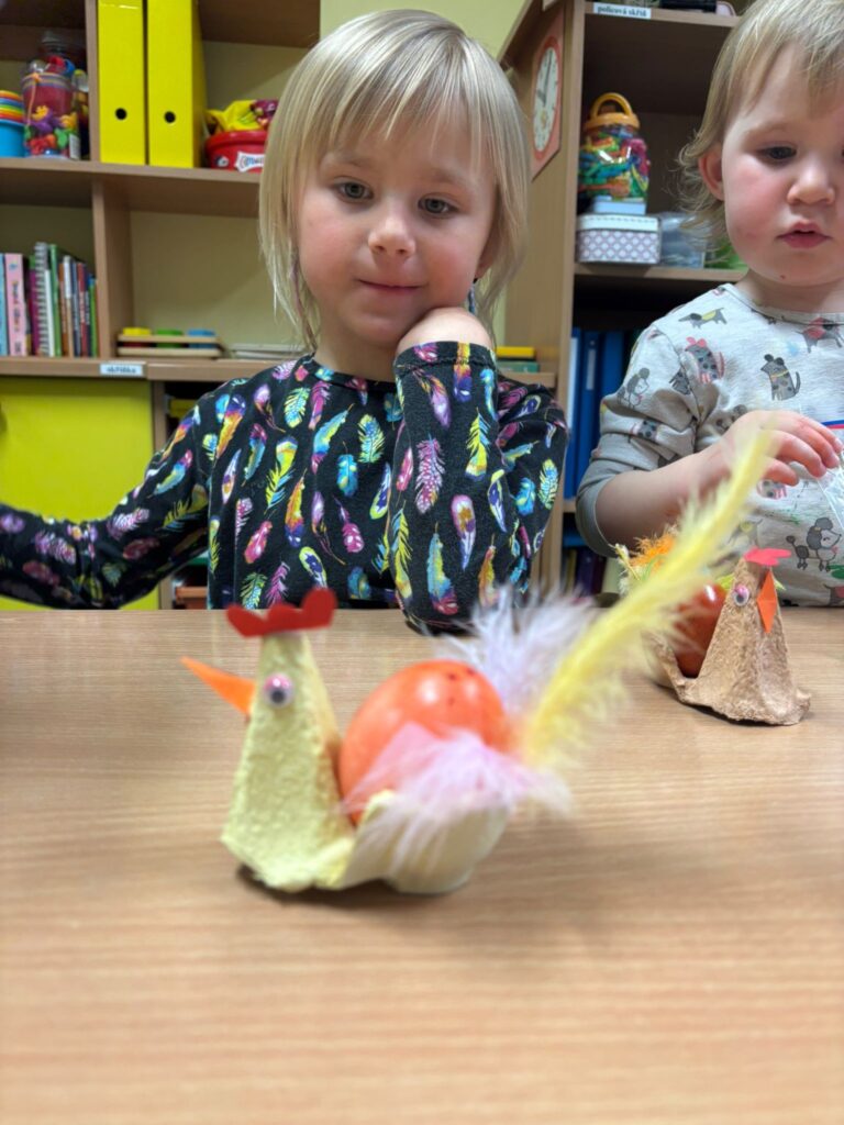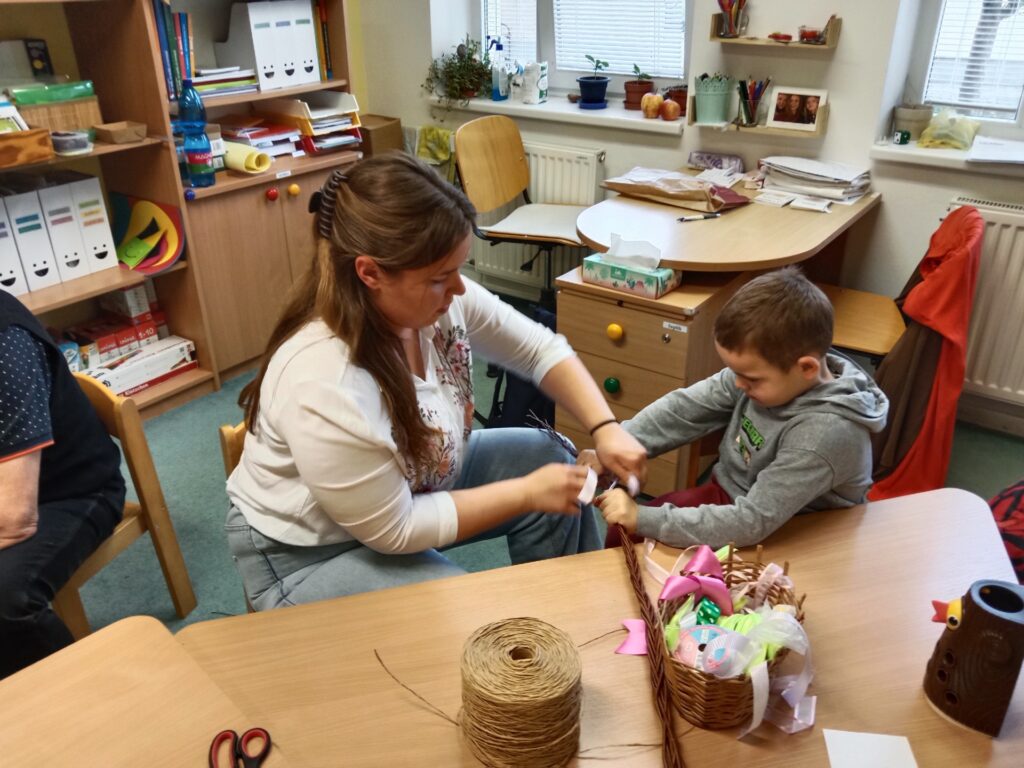 Společné tvoření nabízelo všem širokou škálu možností, nemohlo chybět barvení vajíček, kdy jsme pro letošní rok zvolili techniku barvení rýží. Výsledkem byla krásná vždy originální kropenatá vejce. Rovněž si děti připravily velikonoční osení a vyrobily slepičku, nebo kuřátko, do kterých si mohly své barevné vajíčko vložit. U pletení pomlázek se zapotil nejeden z dospělých, protože zaplést pomlázku z osmi prutů bylo opravdovou výzvou.