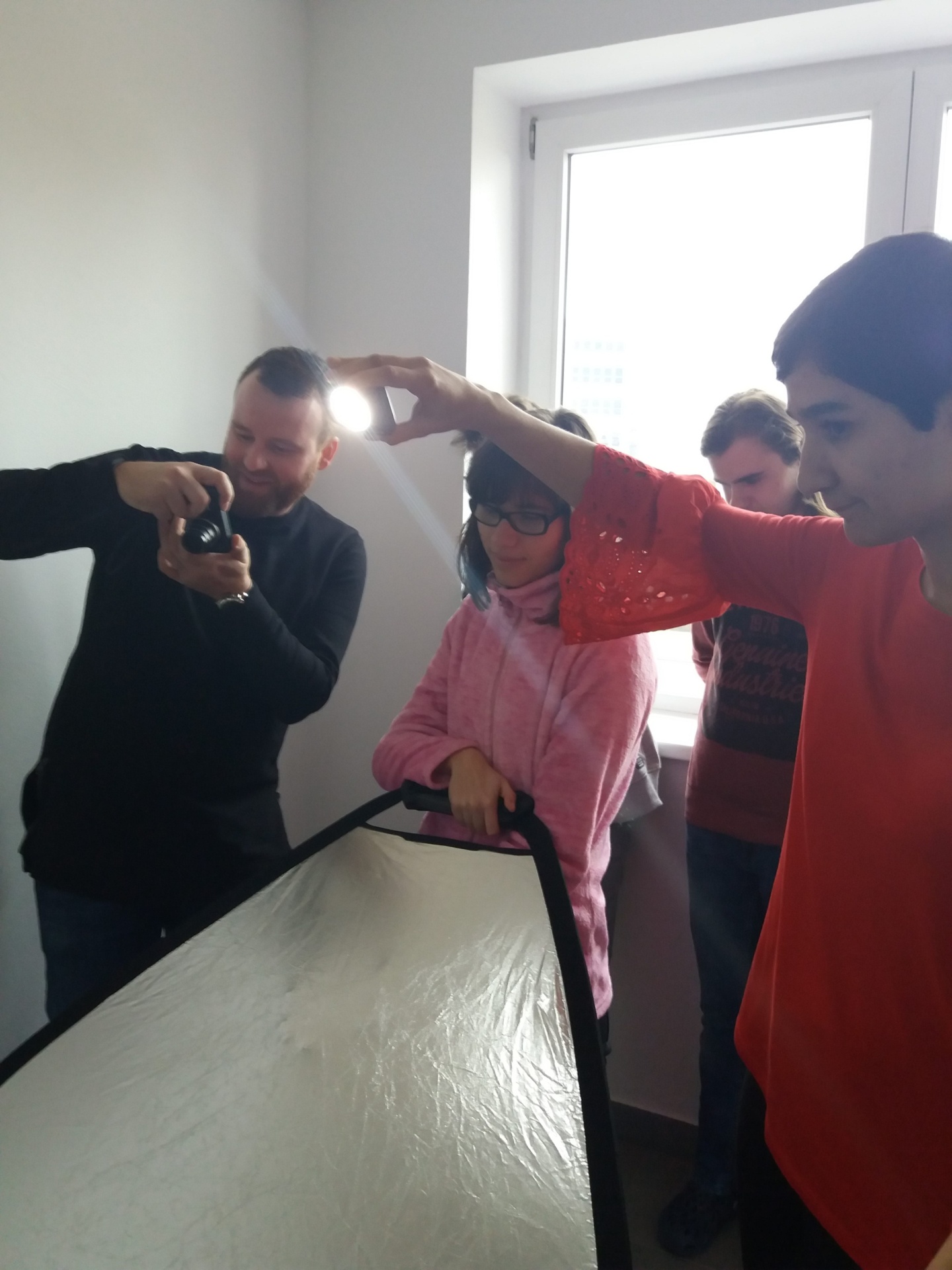 Následoval workshop. Po krátkém úvodu, kdy se Lukáš ptal, kdo fotí fotoaparátem a kdo fotí na mobilní telefon, začala hodina praktického nácviku fotografování. Žáci se dozvěděli, jak své fotky mohou vylepšit. Dozvěděli se, jakým způsobem se přes fotoaparát dívat na focený objekt, jak důležité je při focení světlo a co dělat, aby fotografie nebyly rozmazané. Žáci fotografovali portréty i skupinové fotografie na schodiště a v dalších prostorách školy. Velké okno poskytlo dostatek světla a postupně byli do snažení vtaženi všichni účastníci workshopu. Atmosféra se uvolnila a žáci začali Lukášovi klást všetečné otázky. Žádnou z nich nebyl zaskočen. Každý si na závěr mohli odnést pár důležitých rad, které mu při focení pomohou.